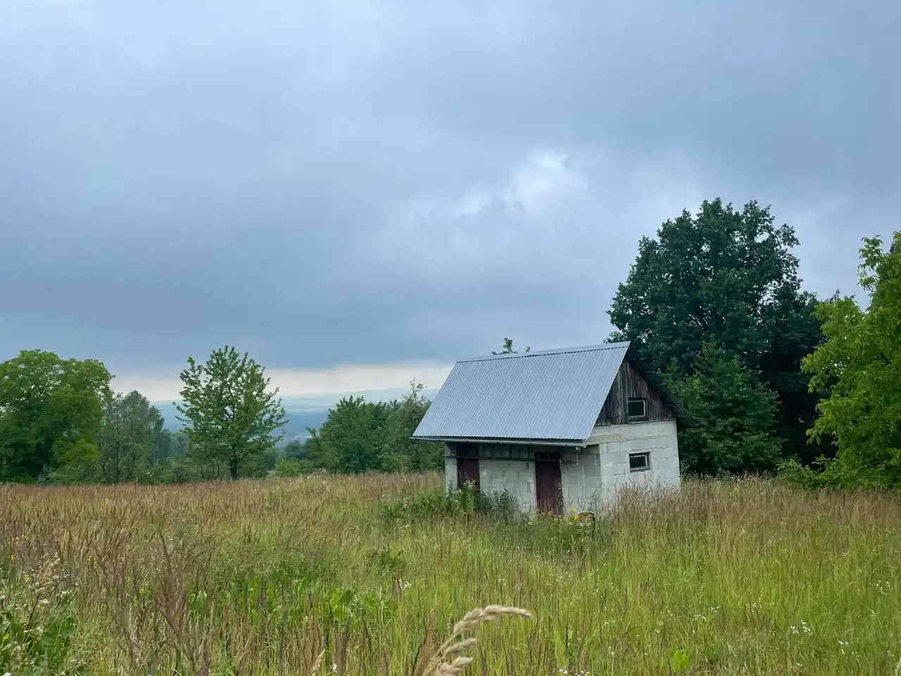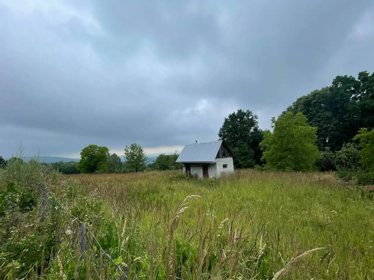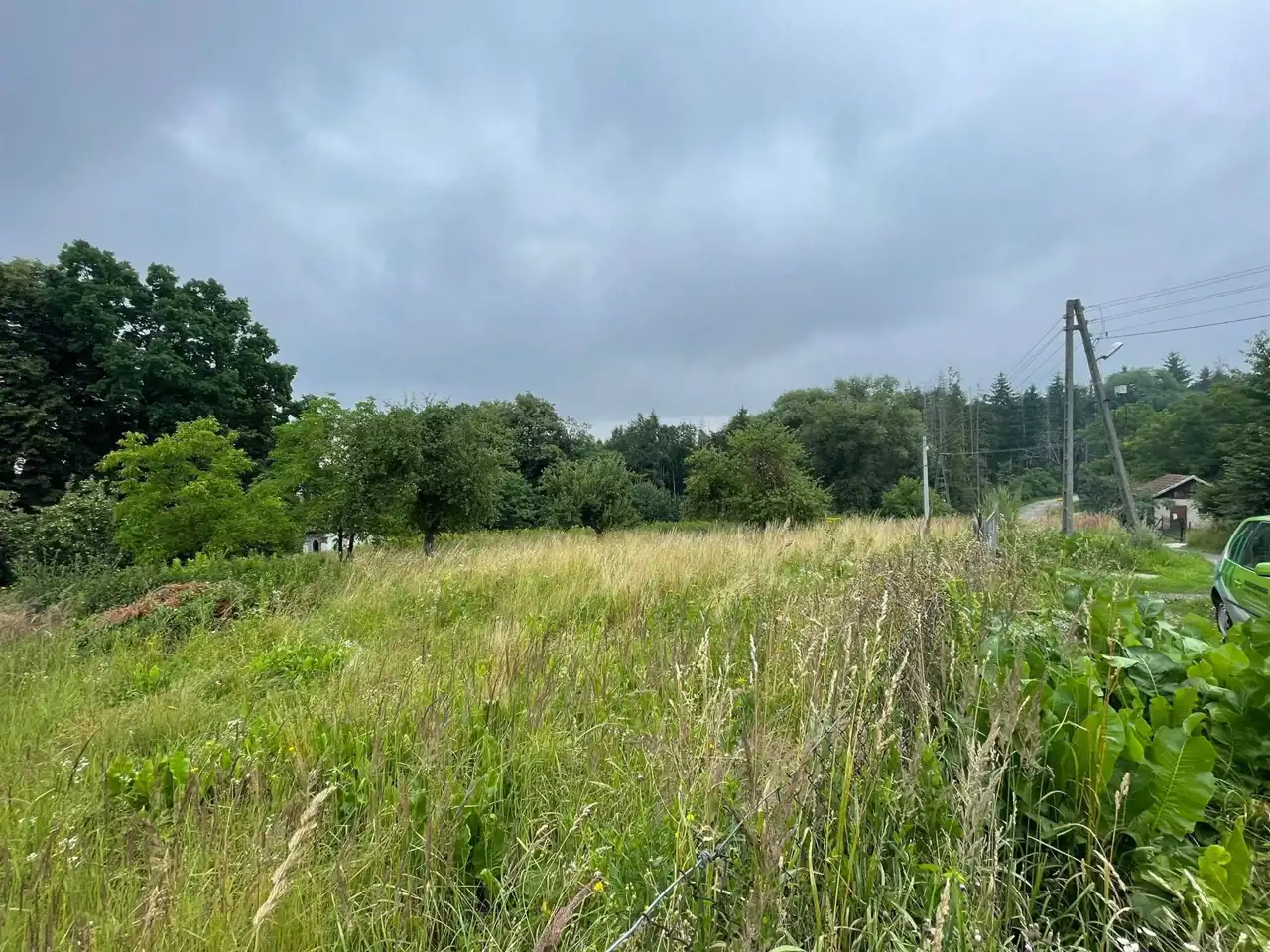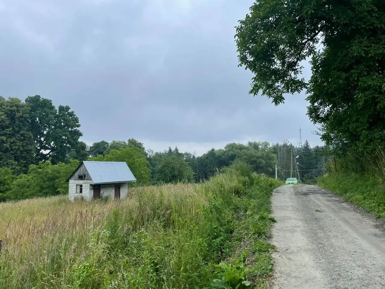 Działka zabudowana małym budynkiem gospodarczym.