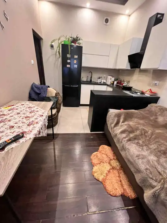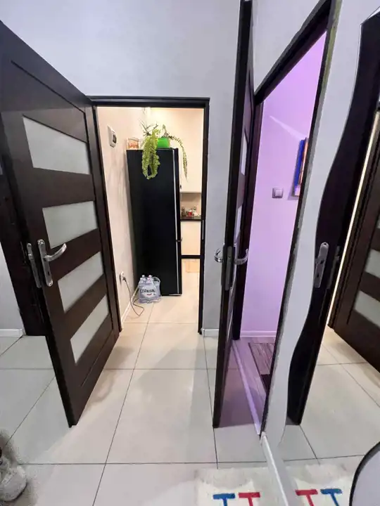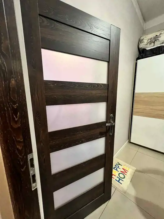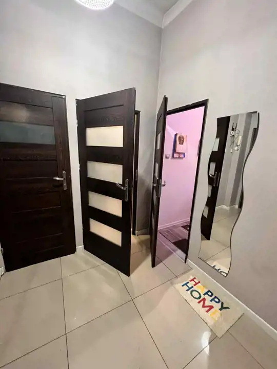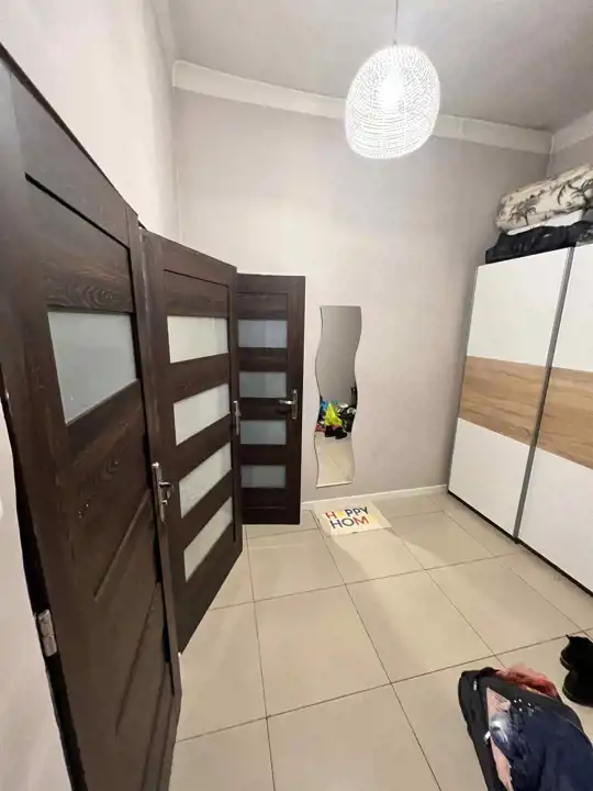 Mieszkanie wyposażone jest w niezbędne meble i gadżety. Na podłodze panele i płytki.