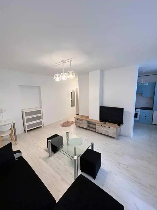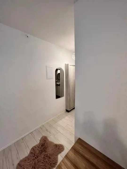 Wchodzimy do mieszkania przez przestronny korytarz. Następnie mamy wejście do łazienki z WC. W łazience kabina prysznicowa i pralka. Salon połączony z nowoczesną kuchnią.