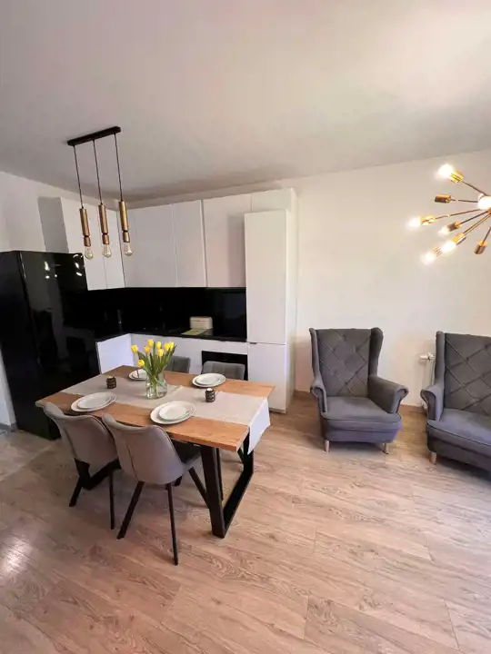 Salon wyposażony w fotele, stół z krzesłami I aneks kuchenny z meblami (lodówka, zmywarka, piekarnik, płyta indukcyjna, okap, mikrofalówka, czajnik).