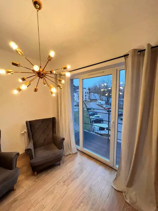 Apartament o powierzchni 60 m2 składa się z umeblowanego salonu z aneksem kuchennym i trzema oddzielnymi pokojami, łazienką.