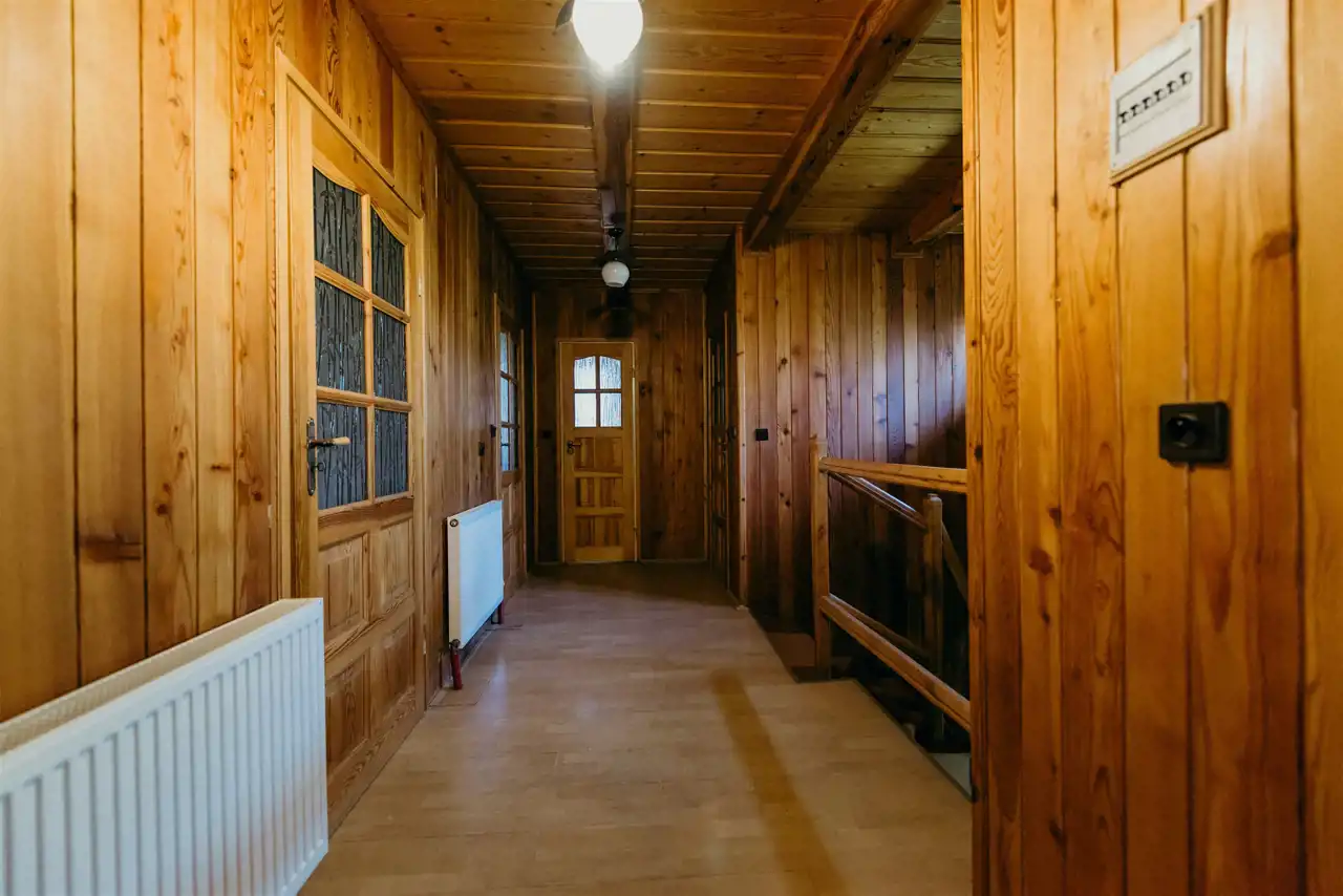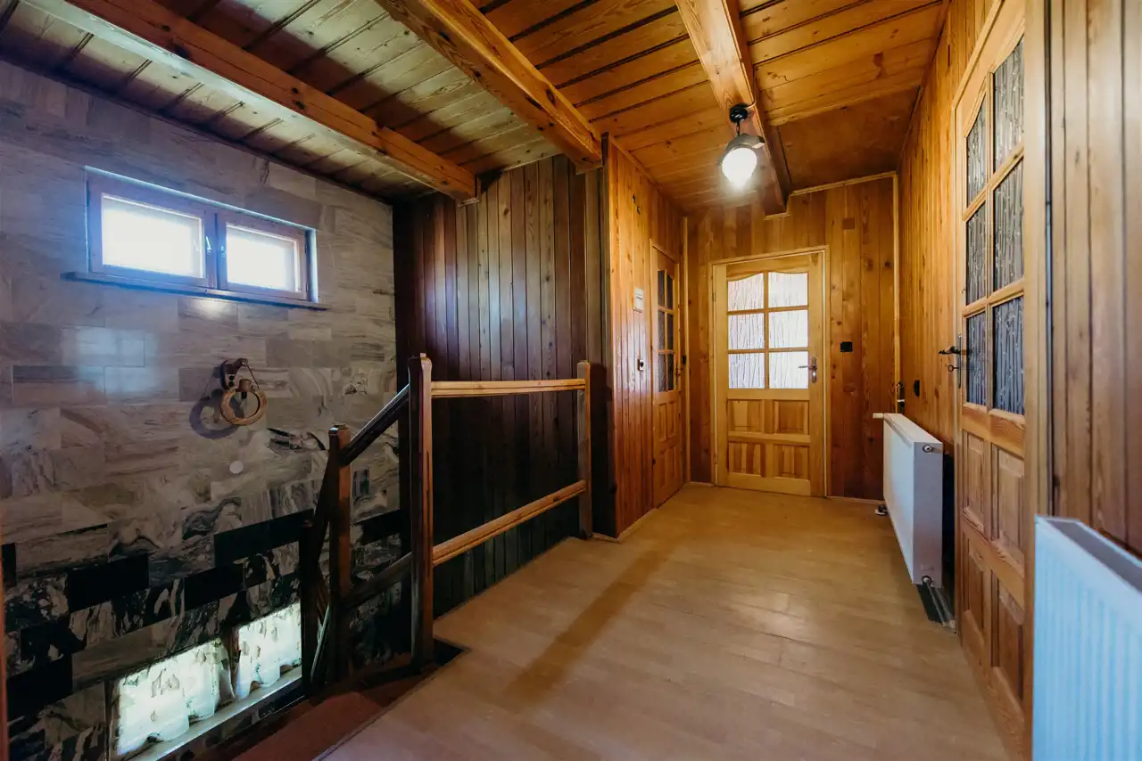 Na parterze mieści się salon z wyjściem na kamienny taras, jadalnia z kuchnią, łazienka, pomieszczenie gospodarcze, przedpokój z kominkiem z płaszczem wodnym z murowanymi schodami, które prowadzą na piętro