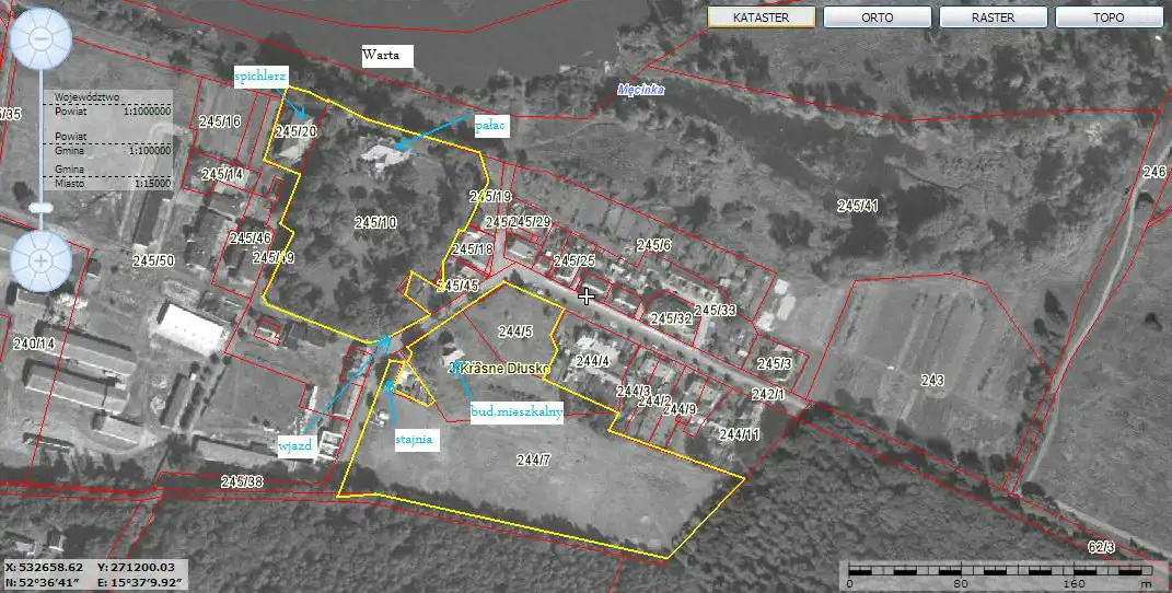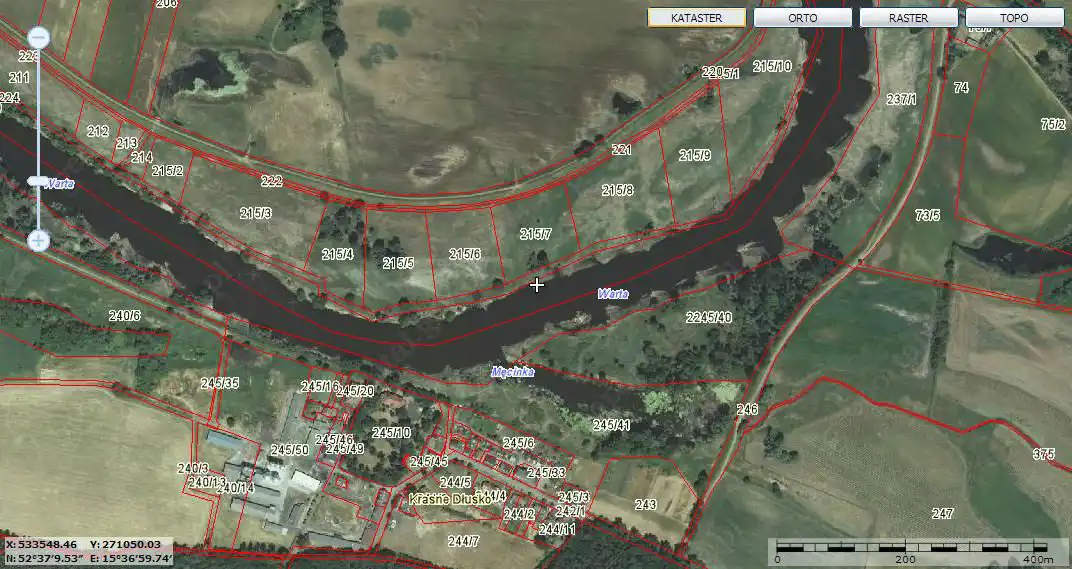 Nieruchomość znajduje się w małej wiosce Krasne Dłusko położonej tuż nad Wartą w otoczeniu sosnowych lasów, po drugiej stronie Warty – Puszcza Notecka.