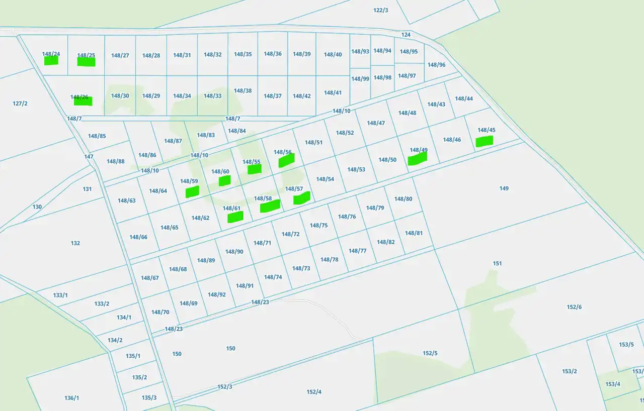 Prąd w drodze. Woda w gruncie. Numeracja działek w ofercie oznaczona na planie- 148/ 24, 25, 26( większa - ok 4800 m2) , 45, 46- sprzedana, 49, 55, 56, 57, 58, 59, 60, 61. Działki 148/7, 10, 17,23 są przeznaczone pod projektowana drogę wewnętrzną prywatną. Cena do małej negocjacji.Polecam.
