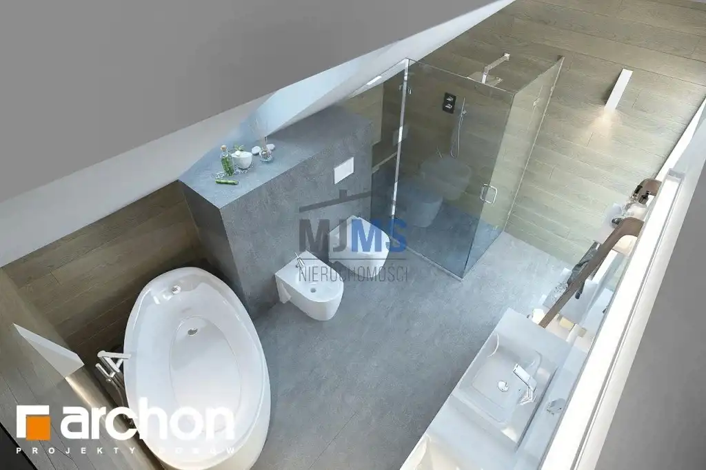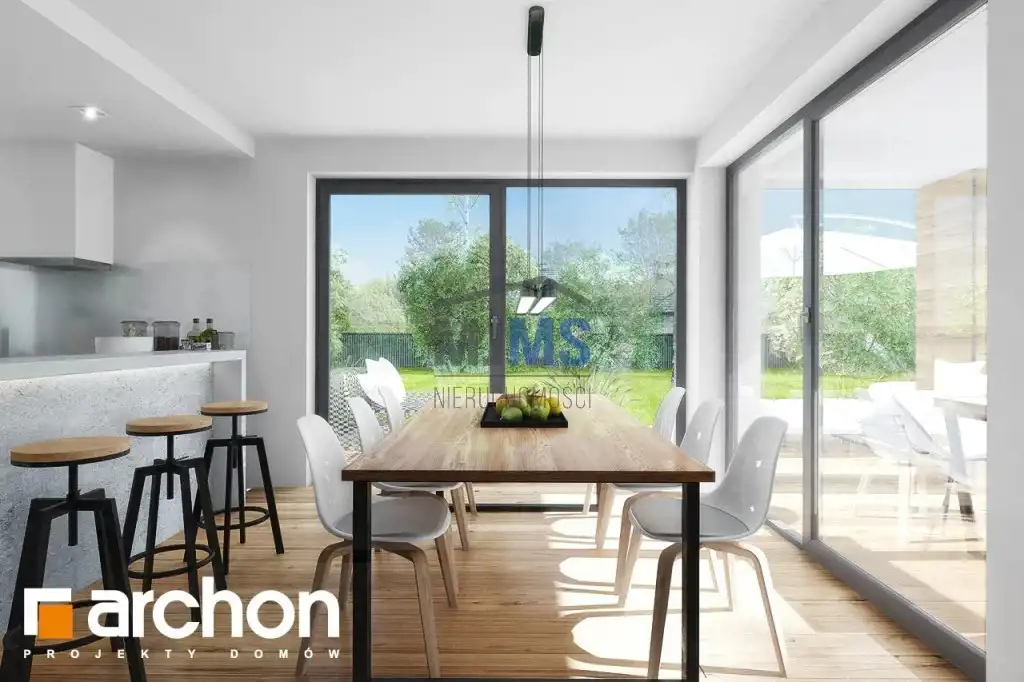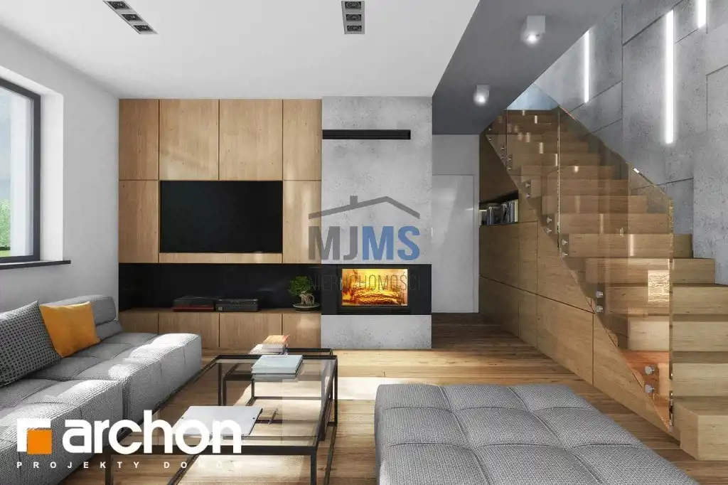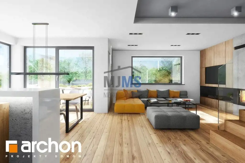 Układ pomieszczeń jest przemyślany i funkcjonalny, z dużym salonem z możliwością zainstalowania kominka, jasną kuchnią, gabinetem, łazienką i wiatrołapem na parterze i trzema sypialniami w tym jedną z garderobą, łazienką i pralnią na poddaszu.
