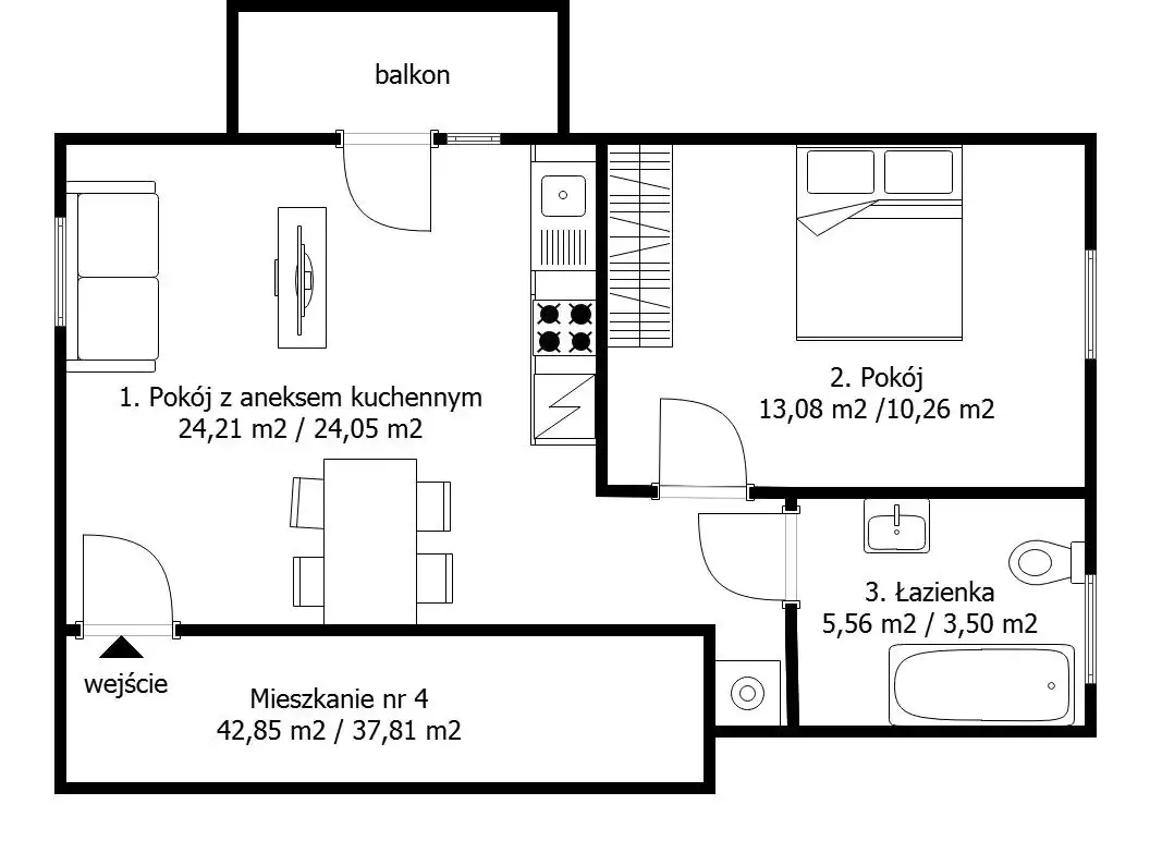 - Salon z aneksem kuchennym – 24,05m² z wyjściem na balkon