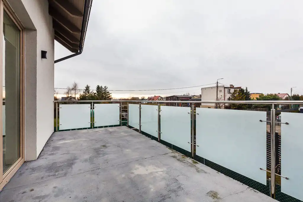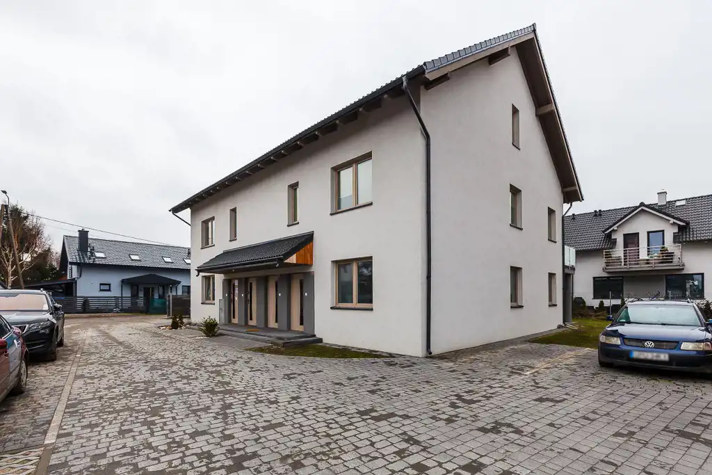 Dach budynku pokryty dachówką w kolorze grafitowym, okna PCV w kolorze szarym, wewnątrz białe. Na działce znajduje się przypisane do każdego apartamentu 2 miejsca postojowe. W standardzie podjazd i obejście wyłożone kostką brukową. Budynek wykończony w wysokim standardzie z materiałów najwyższej jakości, docieplony styropianem grubości 15 cm, okna trzyszybowe, drzwi wejściowe stalowe Termo PRESTIGE z przeszkleniem.