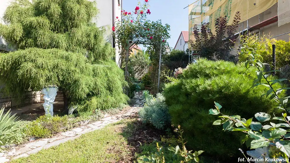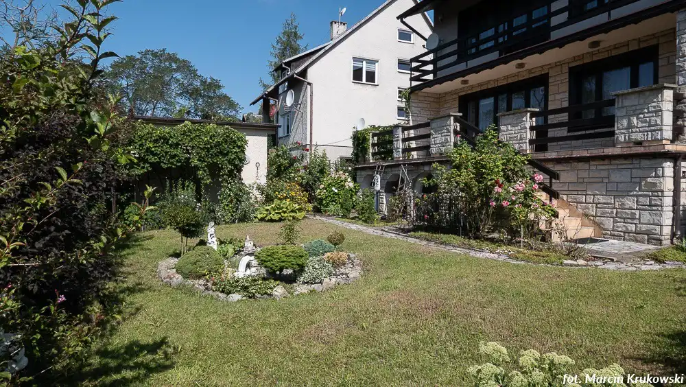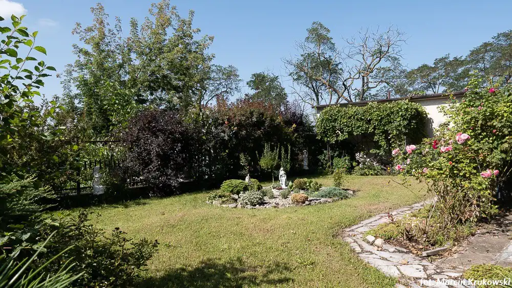 - ogrodzona i zagospodarowana działka z licznymi nasadzeniami