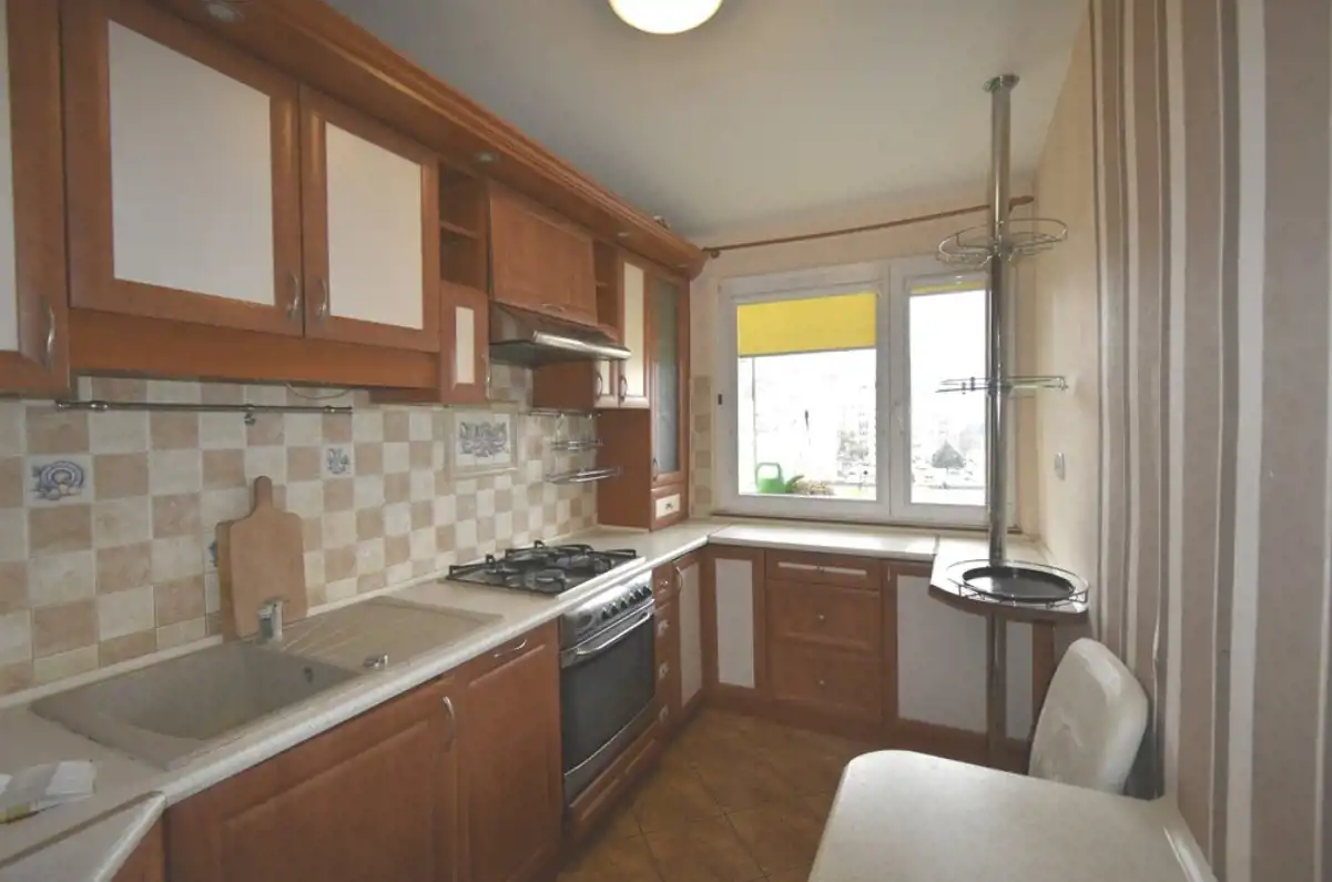 Na 61,5m2 są 3 osobne pokoje, otwarta na przedpokój kuchnia (można połączyć ją z pokojem dziennym), łazienka, WC i przestronny przedpokój z szafą w zabudowie. W największym pokoju jest duży balkon. Na podłogach pokoi i przedpokoju- drewniany parkiet. W łazience jest wanna z natryskiem, umywalką i pralką.