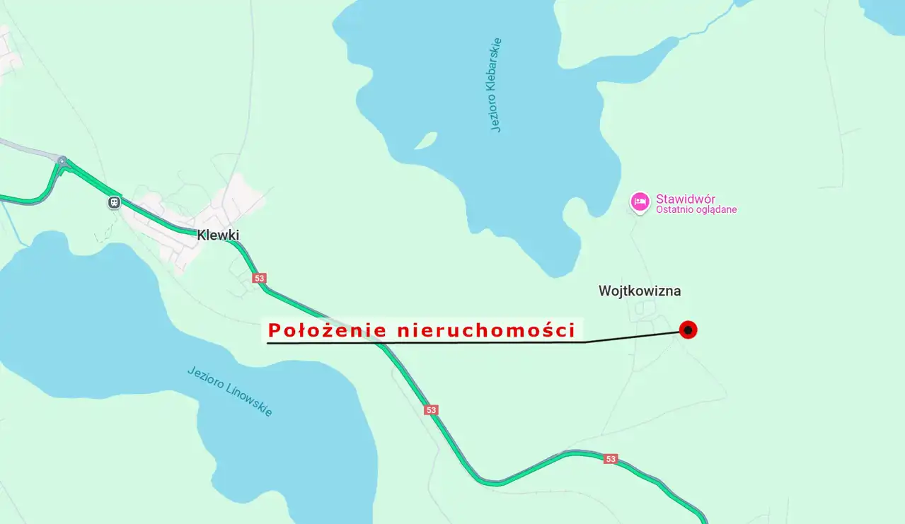 Działka znajduje się w okolicy Jeziora Klebarskiego, co dodatkowo zwiększa jej atrakcyjność zarówno rekreacyjną, jak i inwestycyjną. Teren działki był oczyszczany z nadmiaru samosiewów, co ułatwia proces budowy.