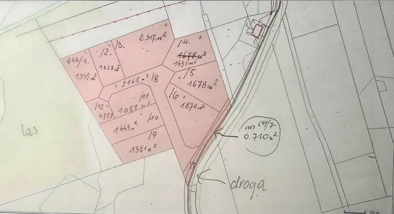 Działki posiadają PZP - teren przeznaczony jest na zabudowę mieszkaniową (MN) z tym że działka 649/8 to droga wewnętrzna, 649/12 -teren na przepompownie ścieków, a 649/7 - rezerwa na poszerzenie drogi gminnej. Pozostałe dziewięć, to działki budowlane.