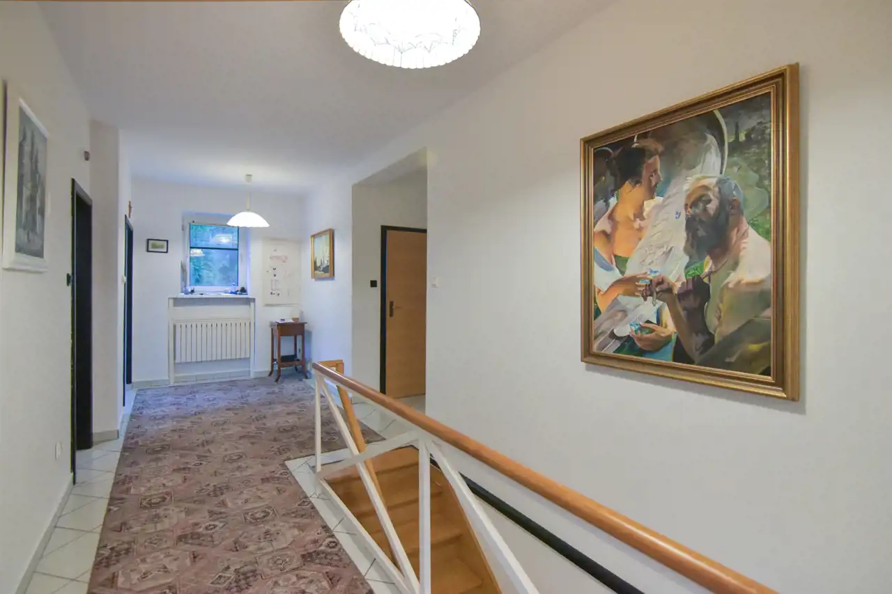 W tym drugim, takim bardziej prywatnym skrzydle, na wprost wejścia przechodzimy do części, gdzie znajduje się wc, łazienka oraz 3 sypialnie.