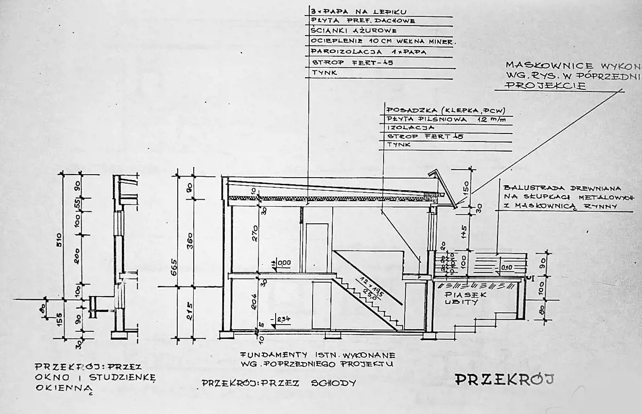 Dom ma płaski dach. Projektowany był jako parterowy ale faktycznie jest to wysoki parter o powierzchni 108 mkw oraz tej samej wielkości dobrze doświetlone wysokie przyziemie z oknami w każdym pomieszczeniu. Obecnie właściciel ma tam 2 gabinety, salę sportową, pralnię i kotłownię ale kondygnacja ta świetnie nadaje się też na firmę, tym bardziej, że oprócz wygodnych drewnianych schodów wewnętrznych, ma osobne wejście z boku domu.