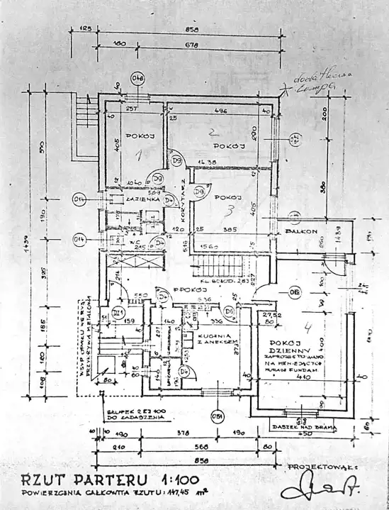 Budynek wymaga odświeżenia ale ciekawy rozkład stwarza duże możliwości aranżacyjne. Po wejściu do przedsionka wchodzimy do dużego przedpokoju, z którego na prawo droga prowadzi obok przestronnej garderoby i kuchni do dużego salonu. Z salonu jest wyjście na mały taras i do ogrodu. Tutaj zdecydowanie otwiera się przed nami koncepcja powiększenia tarasu i poprowadzenia go aż do końca drugiego, cofniętego skrzydła domu.