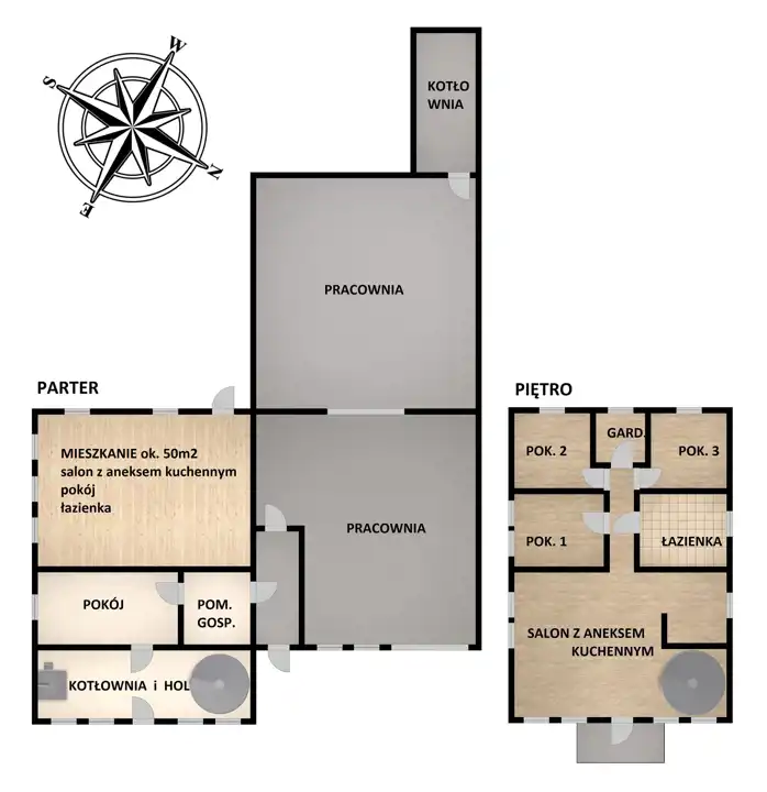 Dla parteru przygotowana jest koncepcja podziału na 8 pokoi z łazienkami oraz salę restauracyjną z kuchnią i zapleczem, co czyni nieruchomość idealną pod obiekt turystyczny lub pensjonat.
