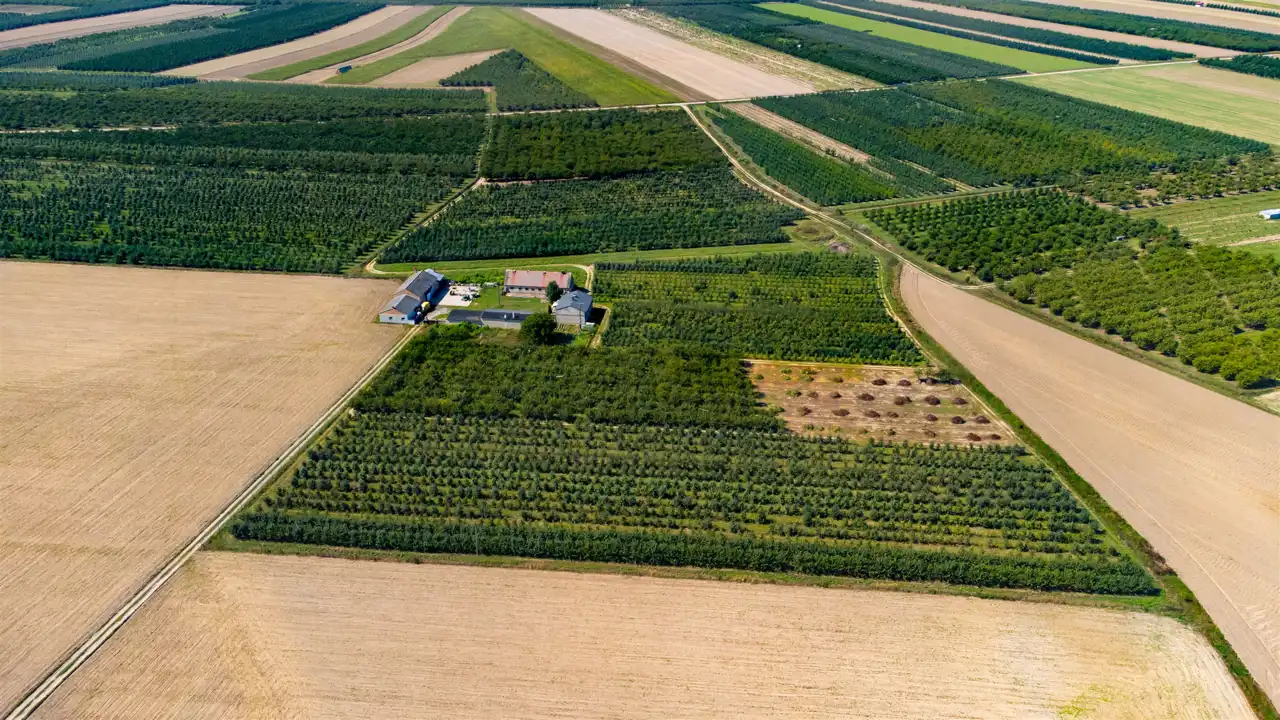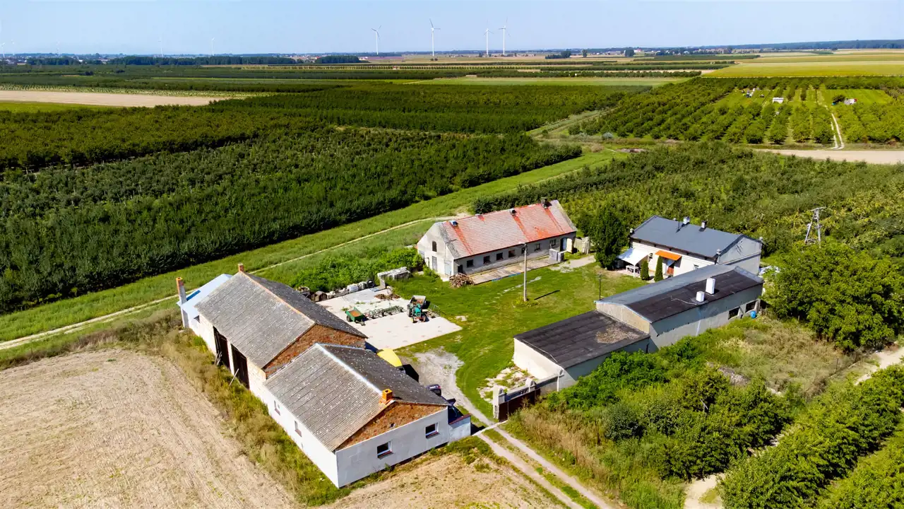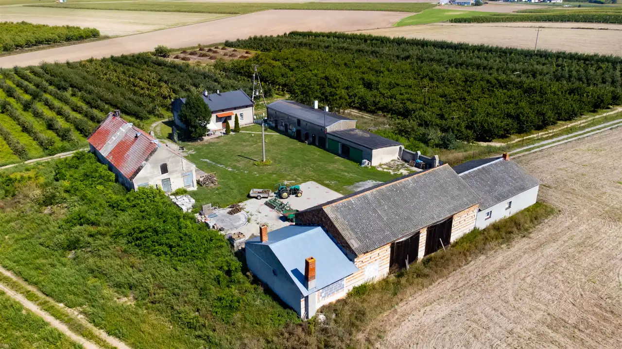Cała nieruchomość składa się z 3 dużych działek. Aktualne nasadzenia to sad owocowy, który jest systematycznie wycinany. Na jednej z działek znajduje się dom oraz budynki gospodarcze, służące do obsługi sadu.
