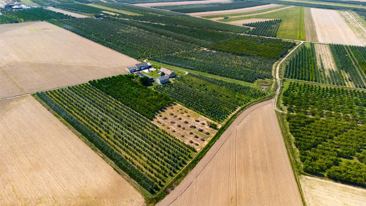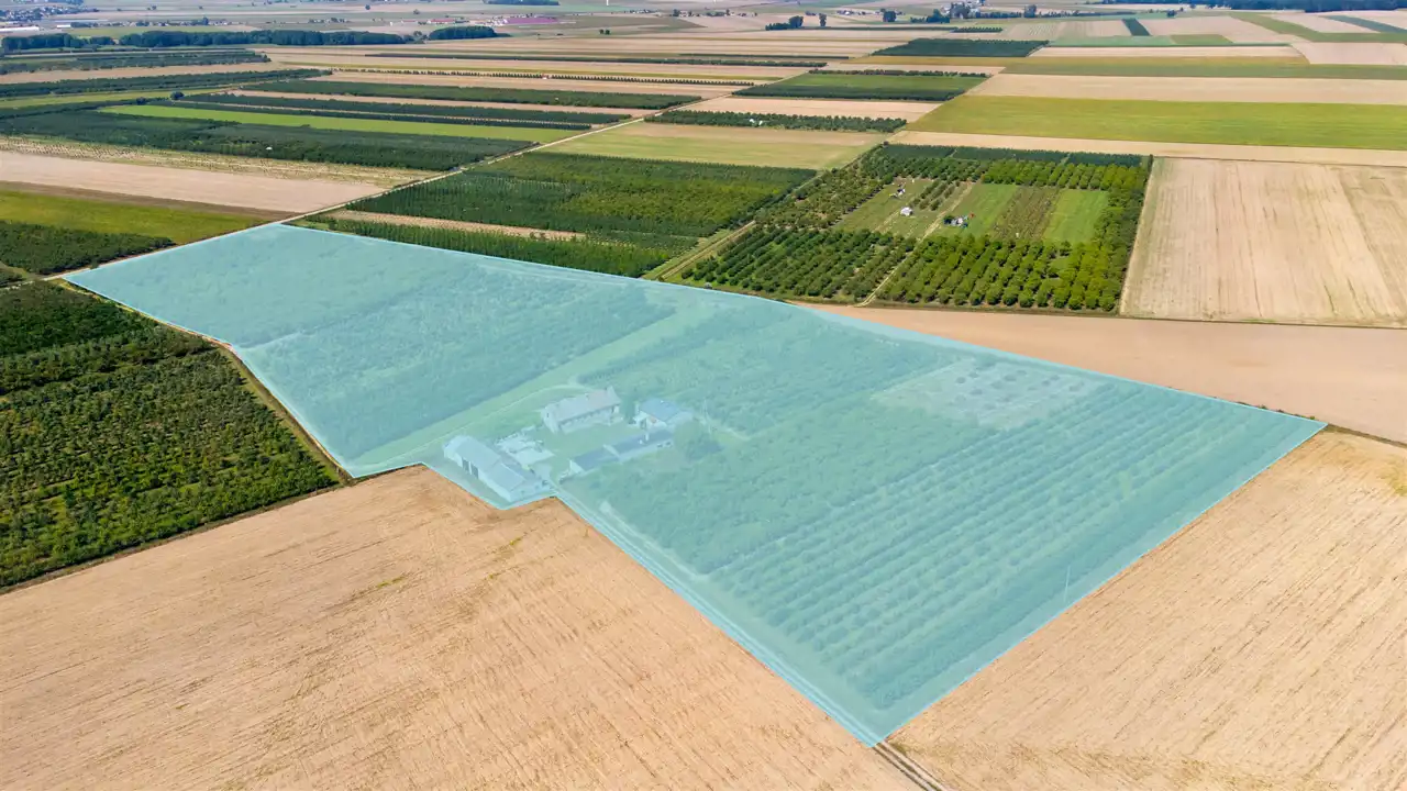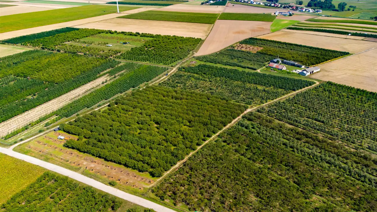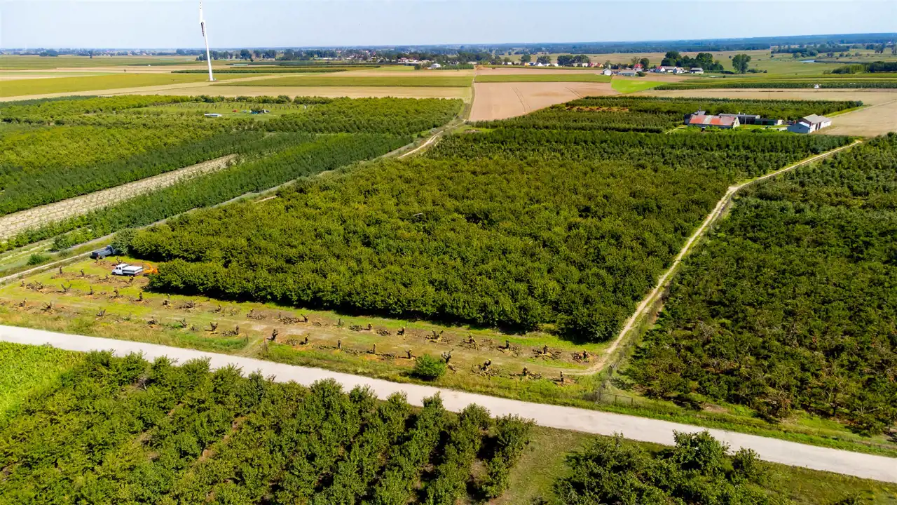 Cała nieruchomość składa się z 3 dużych działek. Aktualne nasadzenia to sad owocowy, który jest systematycznie wycinany. Na jednej z działek znajduje się dom oraz budynki gospodarcze, służące do obsługi sadu.