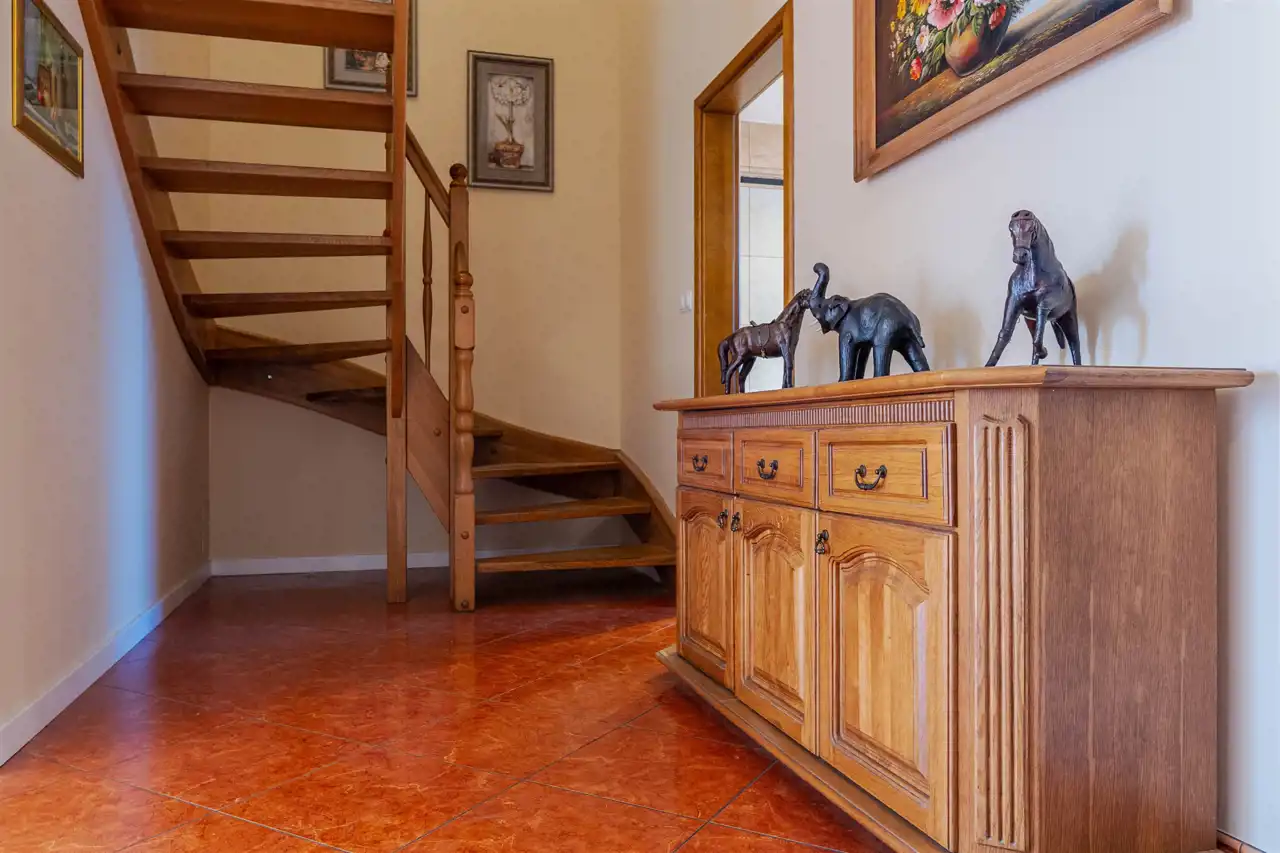 Na piętrze znajduje się hol, łazienka z dużą wanną, cztery pokoje, oraz pralnia z suszarnią. Wejście do