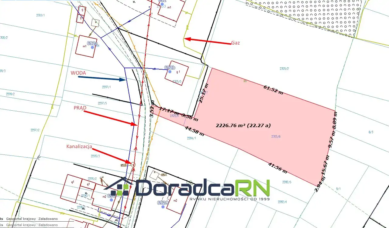 W pobliżu działki znajduje się przydatna infrastruktura, prąd, woda, gaz, kanalizacja sanitarna.
