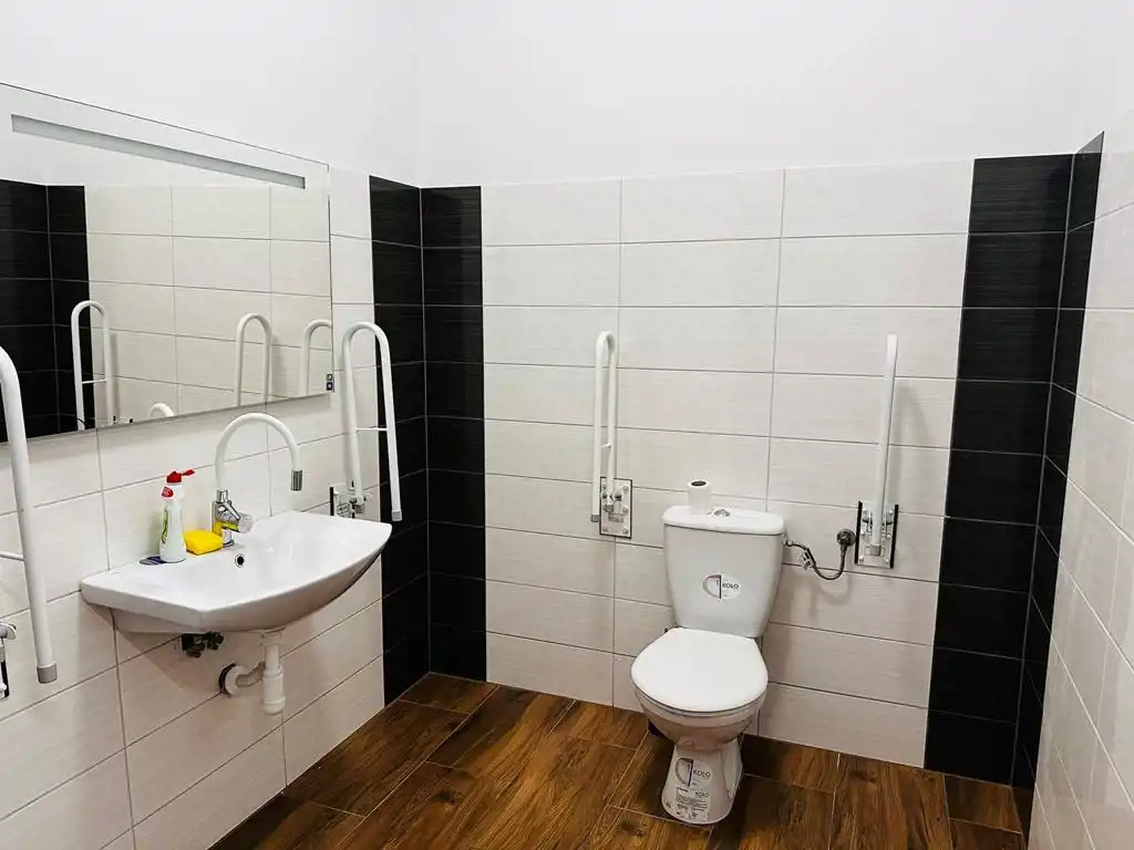 Sanitariat jest wspólny, dostępny dla wszystkich najemców. Budynek wyposażony w instalację alarmową i monitoring oraz szybki internet (światłowód). Przy budynku duży parking na wiele samochodów.