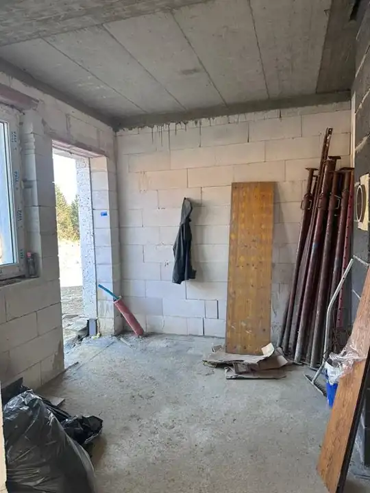 Dom w trakcie budowy, ściany z pustaka pianowego (typu Suporex), ocieplone styropianem 20cm.