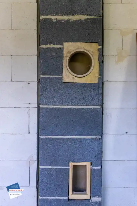 Dom w stanie surowym zamkniętym, ściany z pustaka pianowego (typu Suporex), ocieplone styropianem 20 cm.