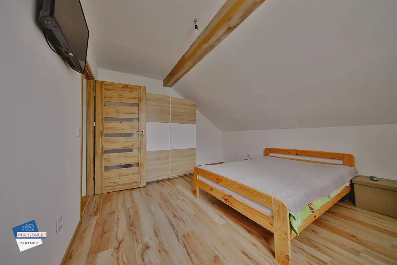 Poddasze: salon z aneksem kuchennym, sypialnia 12 m2, pokój 7 m2, łazienka z wc.
