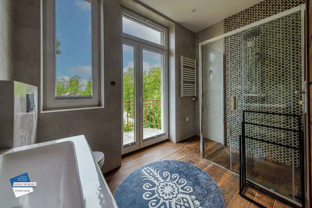 Sporych rozmiarów łazienka z prysznicem oraz wanną oraz wyjściem na balkon, oraz przedpokój.