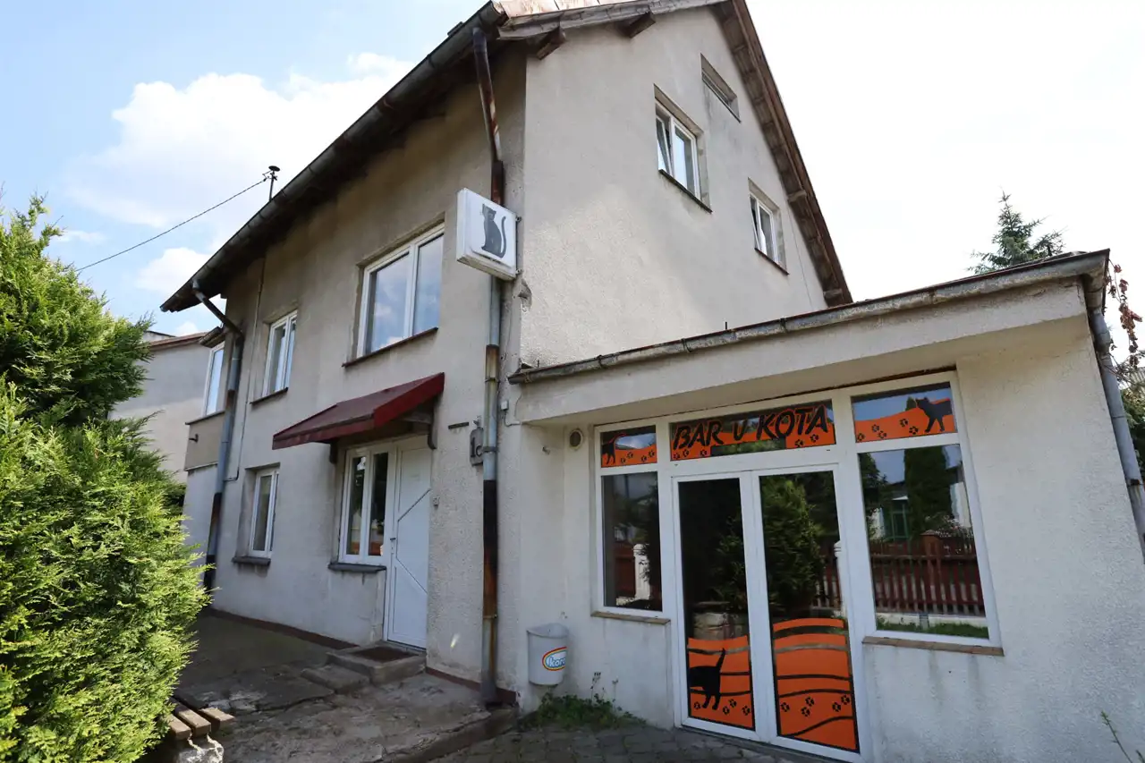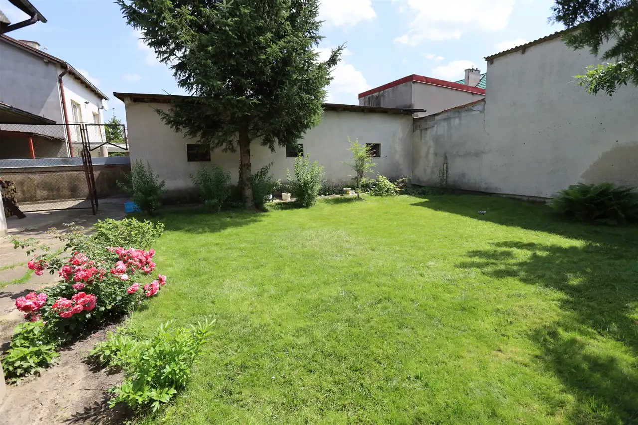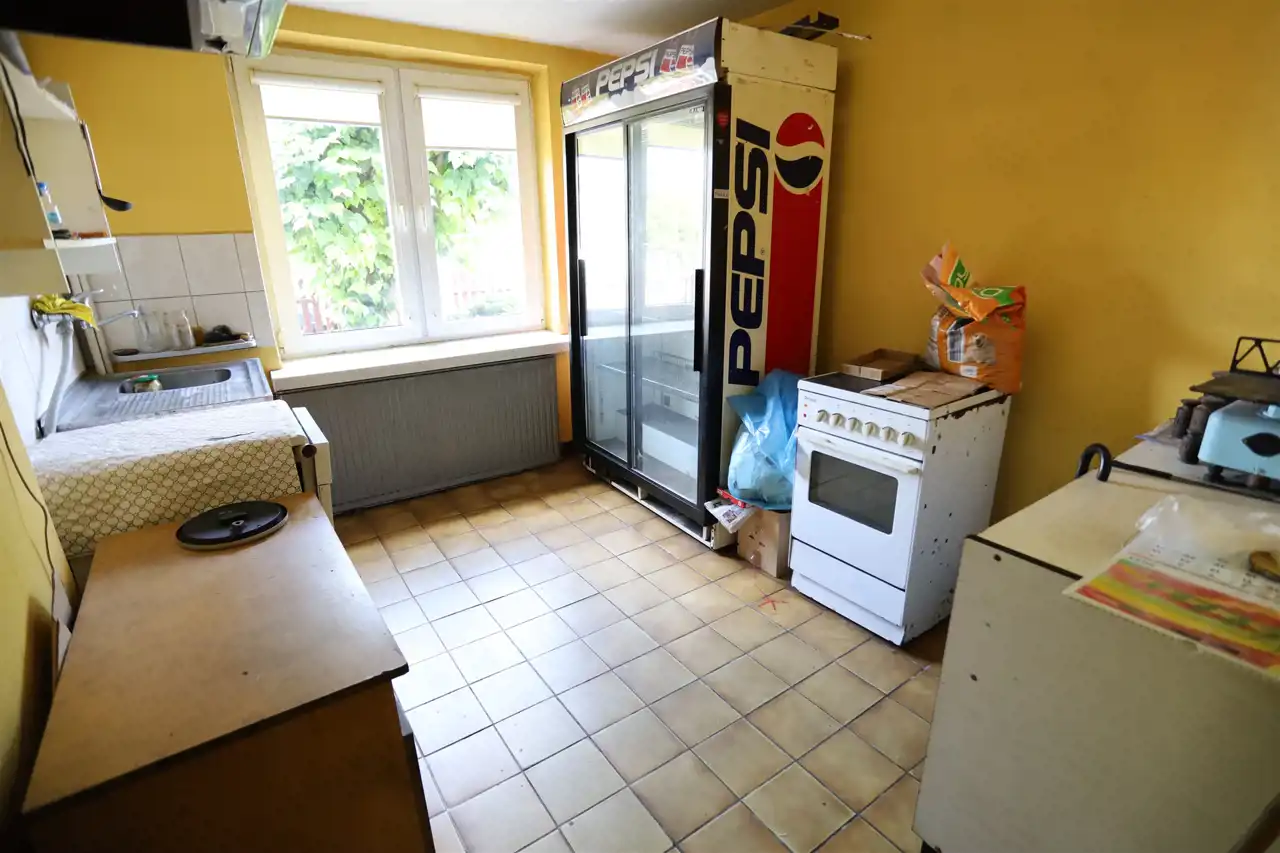 Przyziemie domu składa się z części prywatnej i handlowo-usługowej. W części prywatnej mamy łazienkę (4 m4), kotłownię (4 m2), kuchnię letnią (9 m2) i spiżarkę (4 m2). Część handlowo-usługowa to dwa połączone lokale użytkowe o powierzchni 34 m2 każdy z nich. Obydwa lokale z osobnymi wejściami z zewnątrz, podłączone do instalacji grzewczej i kanalizacyjnej. Pierwszy lokal o wysokości 2,3 m ma dostęp do toalety i jest wyposażony w kominek. Drugi lokal o wysokości 2,4 m ma dostęp do toalety i magazynku (4 m2) oraz posiada osobne wyjście na tył działki.