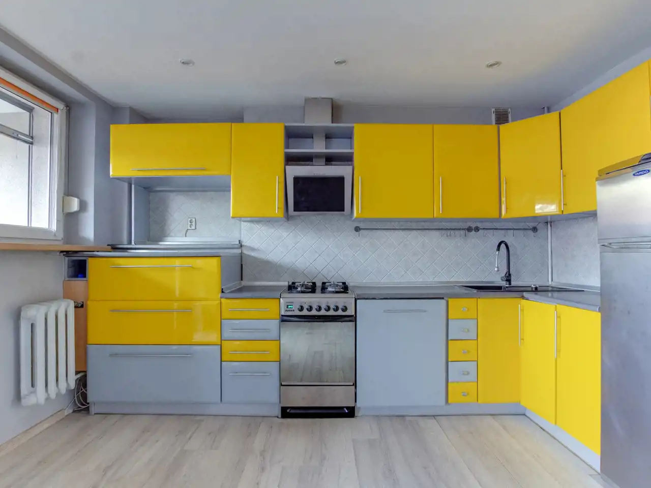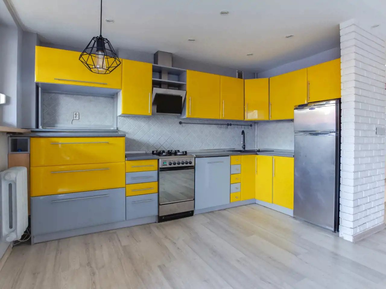 Wyposażenie widoczne na zdjęciach pozostaje na miejscu – w szczególności w kuchni: lodówka, zmywarka, kuchenka gazowa, okap i zabudowa kuchenna.