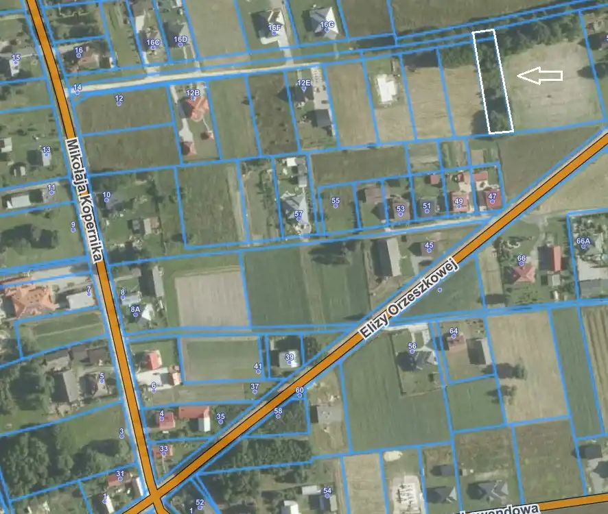 - Dojazd drogą gminną utwardzoną, a następnie na odcinku ok.70m dojazd nieutwardzony. Do ulicy Kopernika ok.300m.