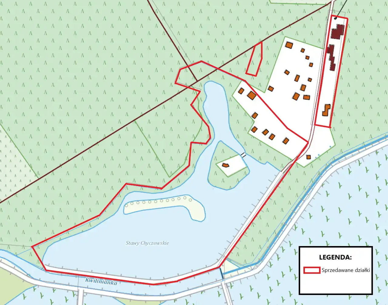 Ośrodek wypoczynkowy umiejscowiony jest na trzech działkach o pow. 5,3ha, 0,4ha, 0,06ha. Na tym terenie znajdują się budynki budowlane (restauracyjno-magazynowy, socjalno-magazynowy, mieszkalno-socjalny), zbiornik wodny o pow. ok. 3,7ha oraz liczne domki kempingowe. Budynki posiadają instalację elektryczną, wodną oraz odpływy kanalizacyjne do szamba.