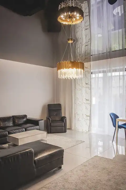 Salon zaprasza do odpoczynku, a duże okna dają światło i poczucie otwartości.