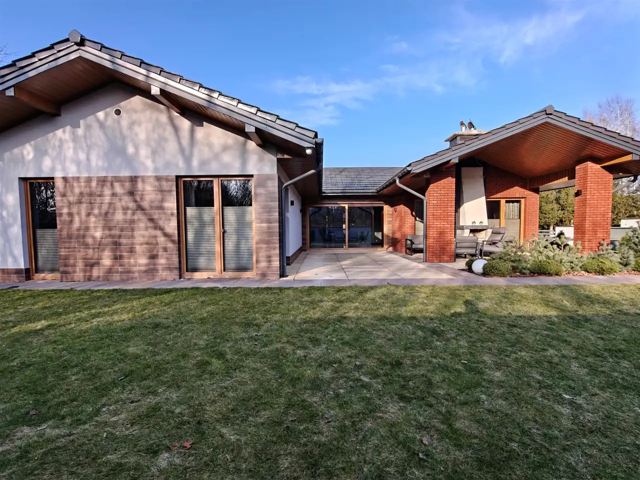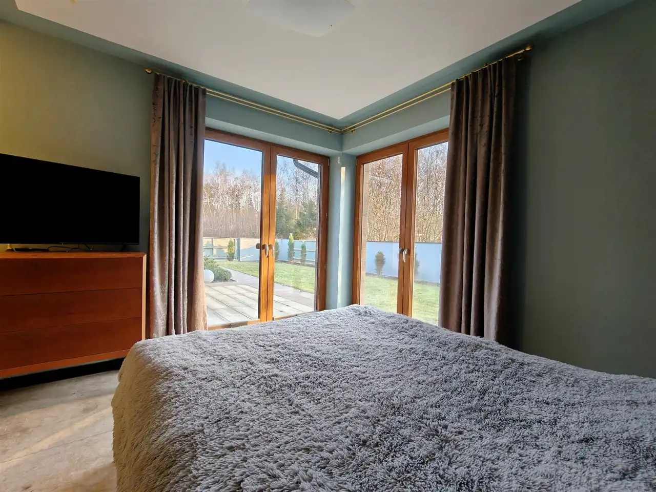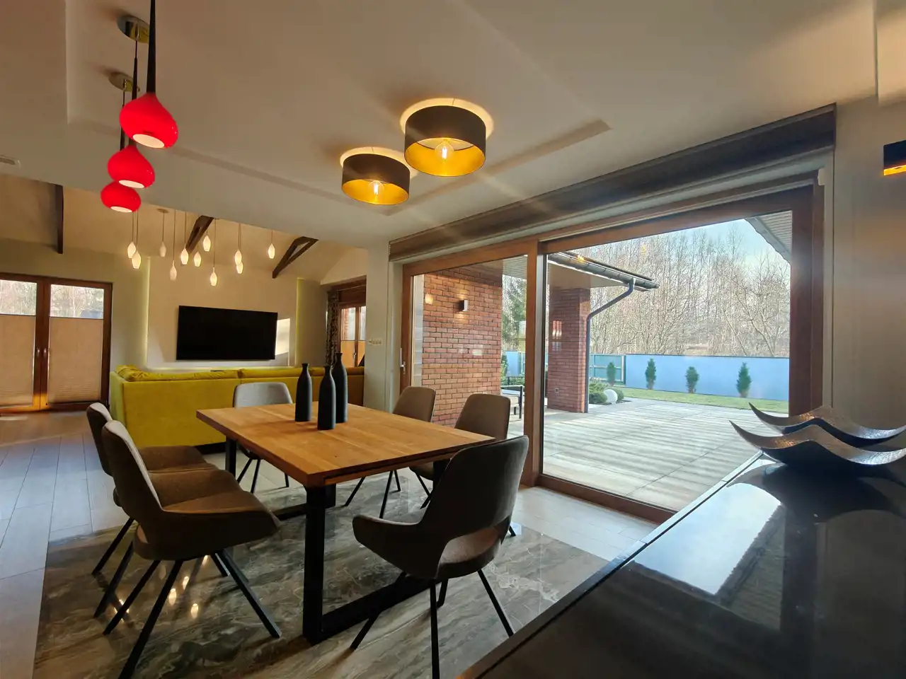 - Przestronny, jasny salon z dużymi przeszkleniami i wyjściem na taras
