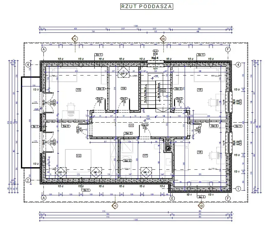 Na użytkowym poddaszu o powierzchni 82 m² znajdują się cztery sypialnie, które mogą pełnić funkcję pokoi dla domowników, gabinetu lub pokoju gościnnego. Dodatkowo zaprojektowano łazienkę oraz praktyczną garderobę.