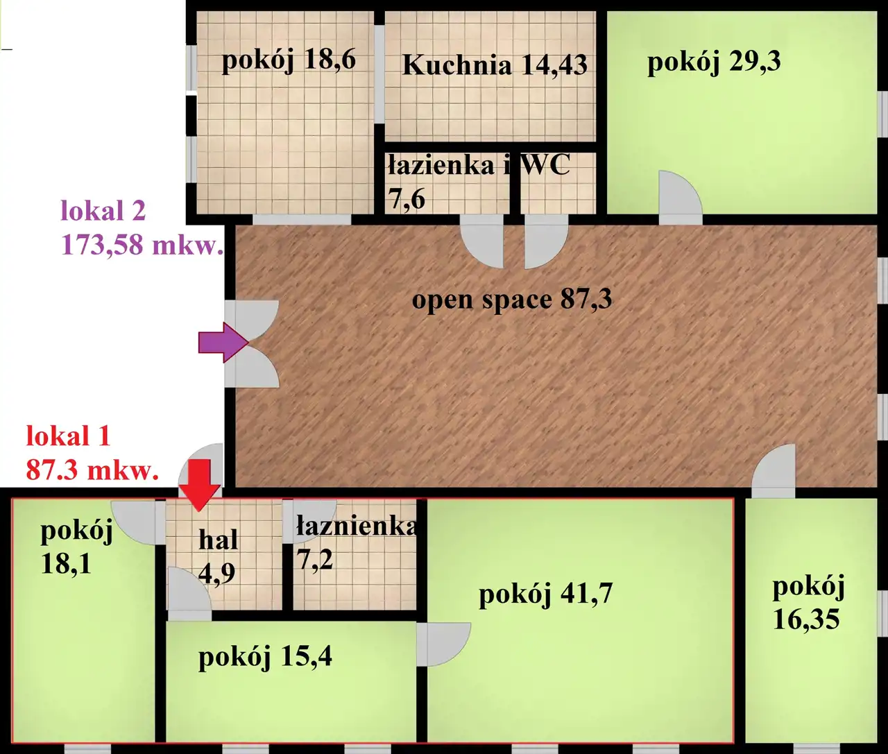 Lokal II - 173,58 mkw. - Open sapce, + 2 pokoje oraz kuchnia z pomieszczeniem socjalnym, 2 łazienki; gotowy do wejścia w ładnym standardzie na 3 piętrze w budynku biurowym. Za budynkiem znajduję się bezpłatny ogrodzony parking.