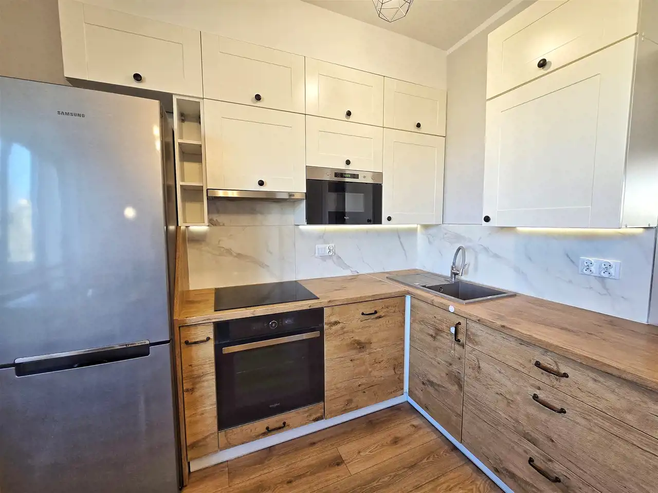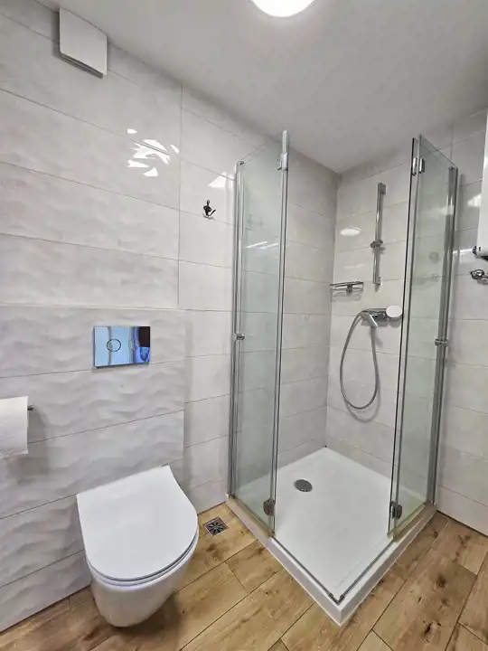Kuchnia: W pełni wyposażona i w zabudowie: zmywarka, lodówka, płyta indukcyjna, zlew oraz mikrofala. Instalacja elektryczna trójfazowa umożliwia bezproblemowe korzystanie z indukcji, a w przyszłości łatwy montaż elektrycznego podgrzewacza wody.