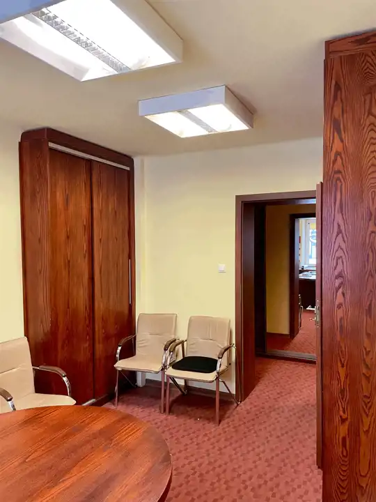 W lokalu zachowany został drewniany parkiet, a na potrzeby działalności biurowej zastosowano wykładzinę dywanową, co pozwala w prosty sposób dopasować wnętrze do indywidualnych potrzeb – biurowych lub mieszkalnych.
