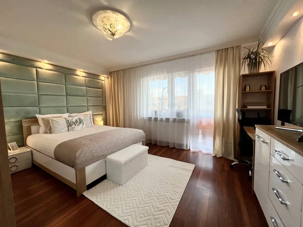 Centralnym punktem mieszkania jest przestronny salon z częścią wypoczynkową oraz miejscem na stół jadalny. Okna zapewniają świetne oświetlenie, a eleganckie wykończenie i spójna kolorystyka tworzą przytulny, ponadczasowy klimat.