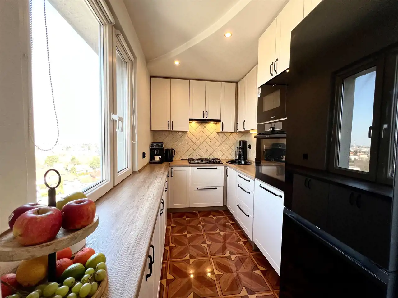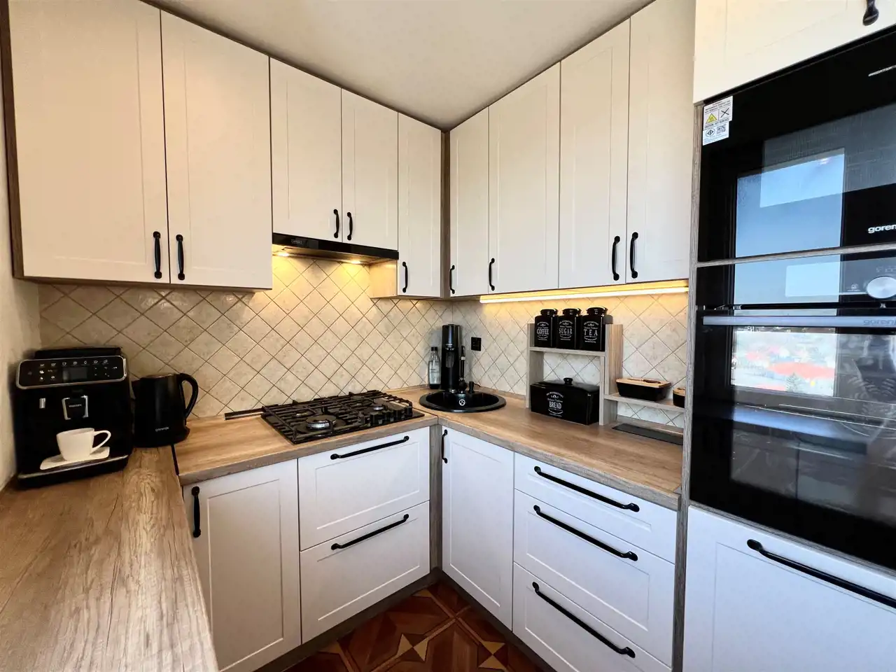 Z salonu prowadzi wejście do nowoczesnej kuchni, wyposażonej w sprzęt AGD- funkcjonalnej i gotowej do codziennego użytkowania.
