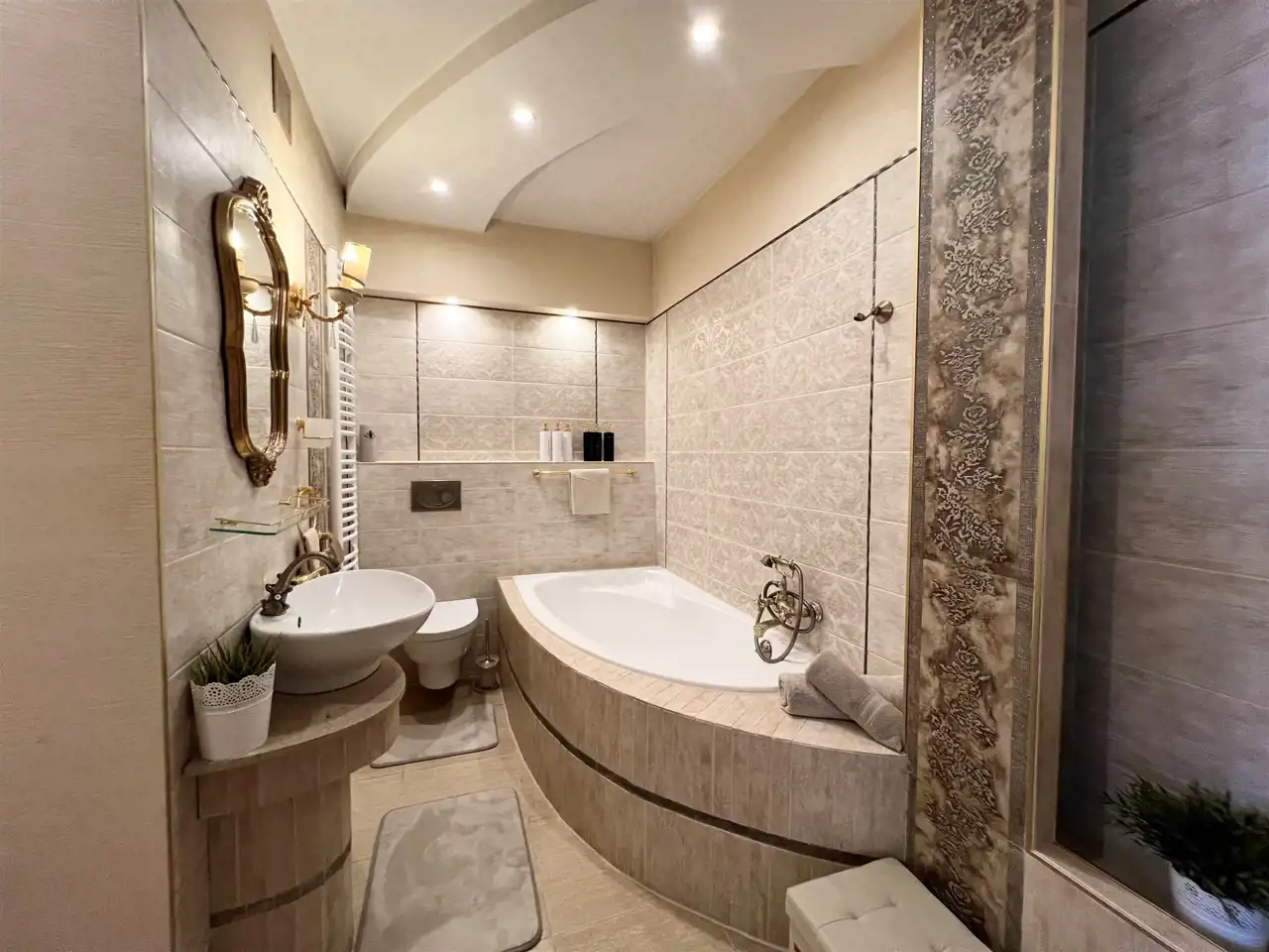 Duża, efektownie zaaranżowana łazienka to zdecydowany wyróżnik tej nieruchomości.