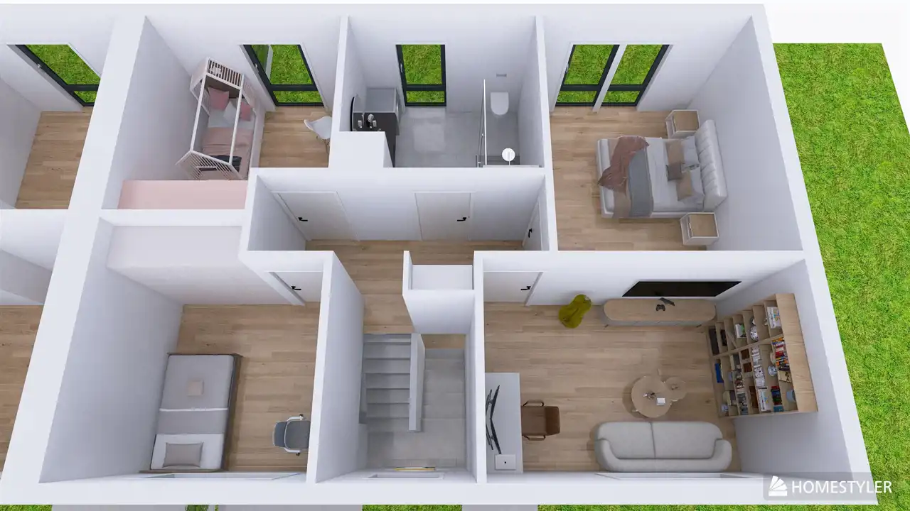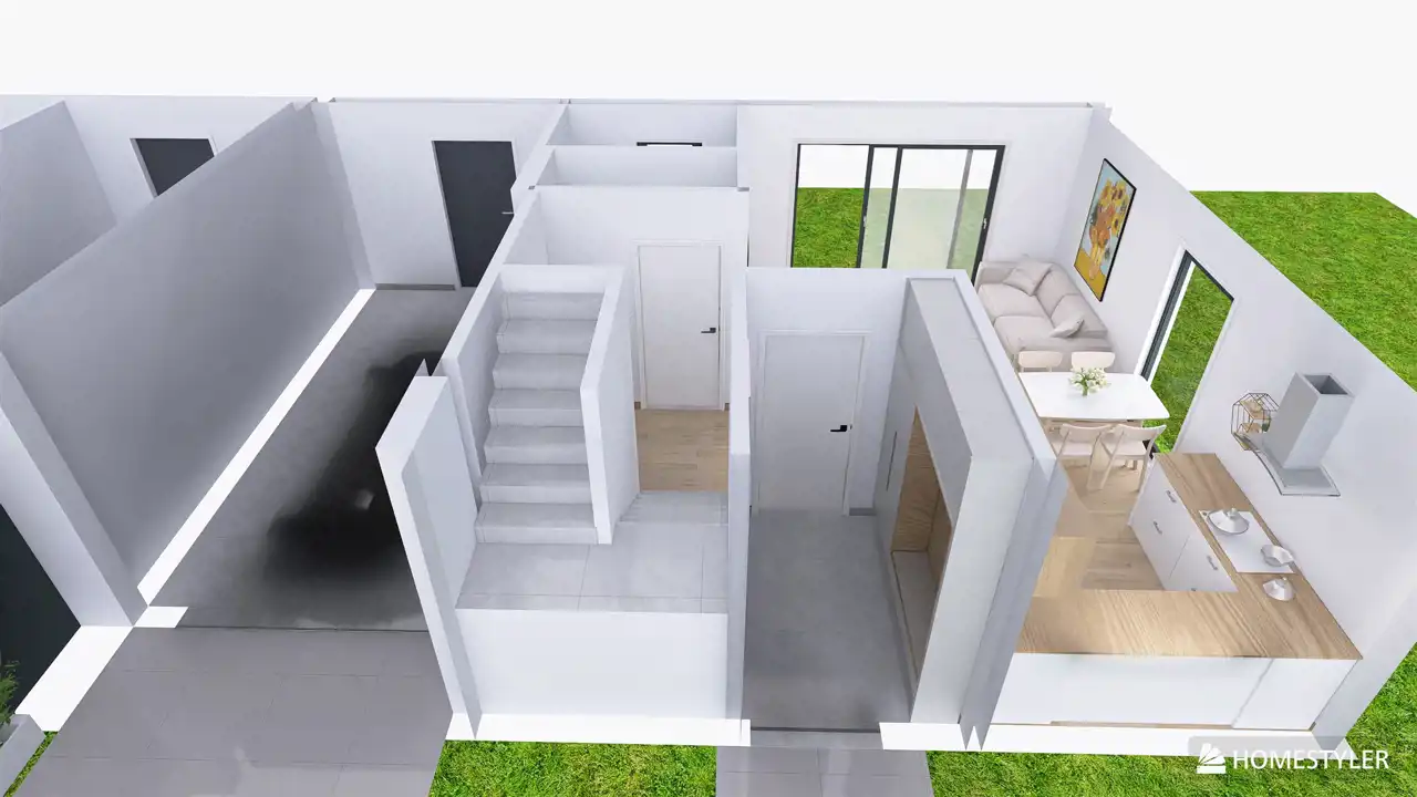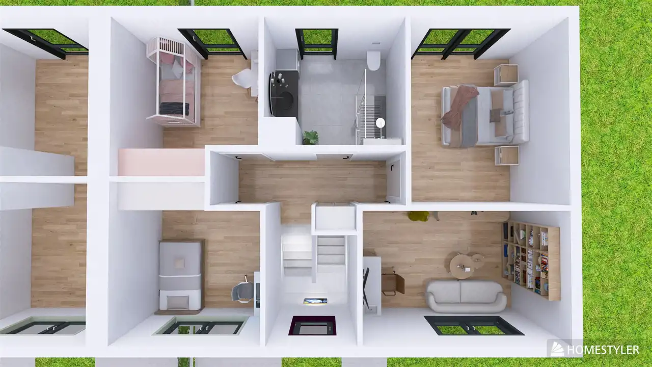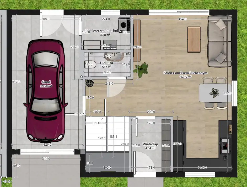 Parter: Przestronny hol prowadzi do otwartej strefy dziennej, obejmującej salon z jadalnią oraz kuchnię. Znajduje się tu również funkcjonalna toaleta oraz pomieszczenie gospodarcze.