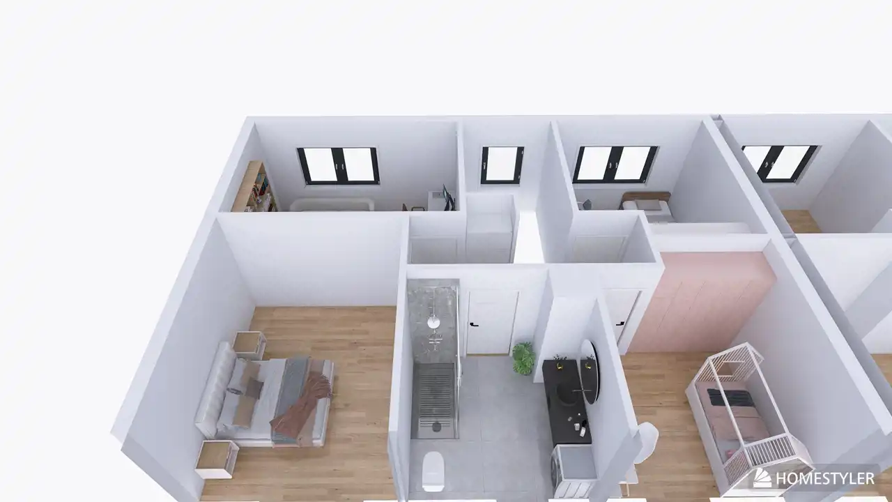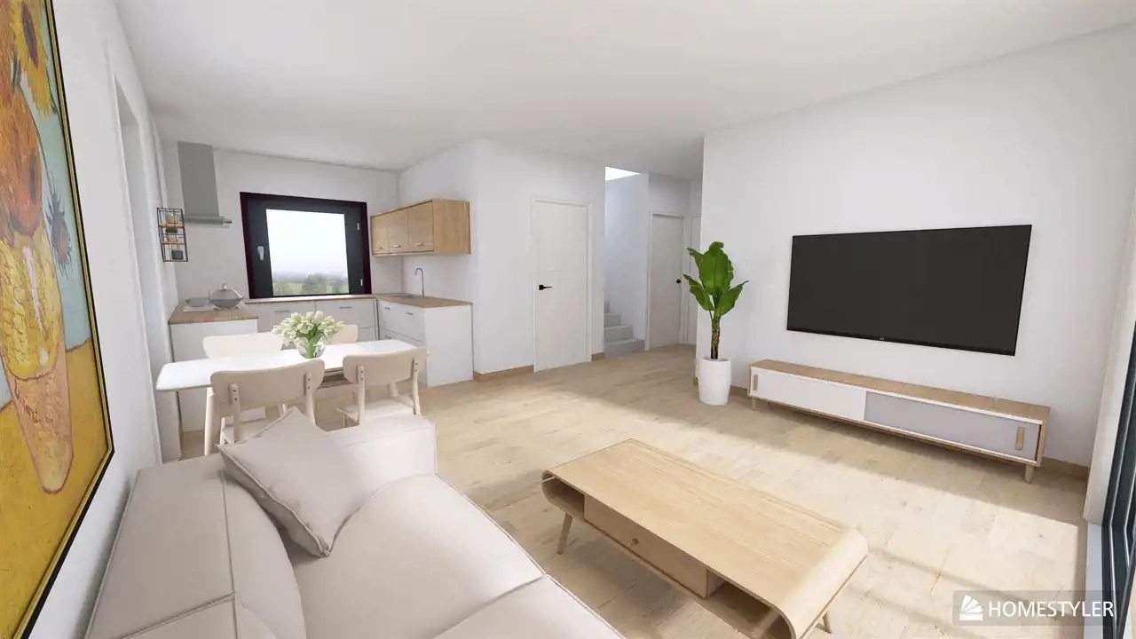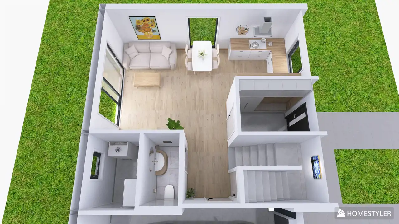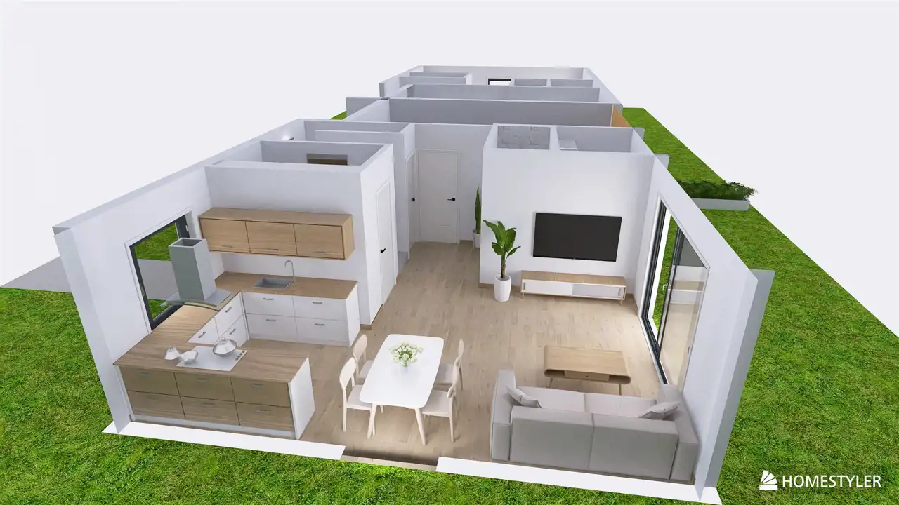Parter: Przestronny hol prowadzi do otwartej strefy dziennej, obejmującej salon z jadalnią oraz kuchnię. Znajduje się tu również funkcjonalna toaleta oraz pomieszczenie gospodarcze.