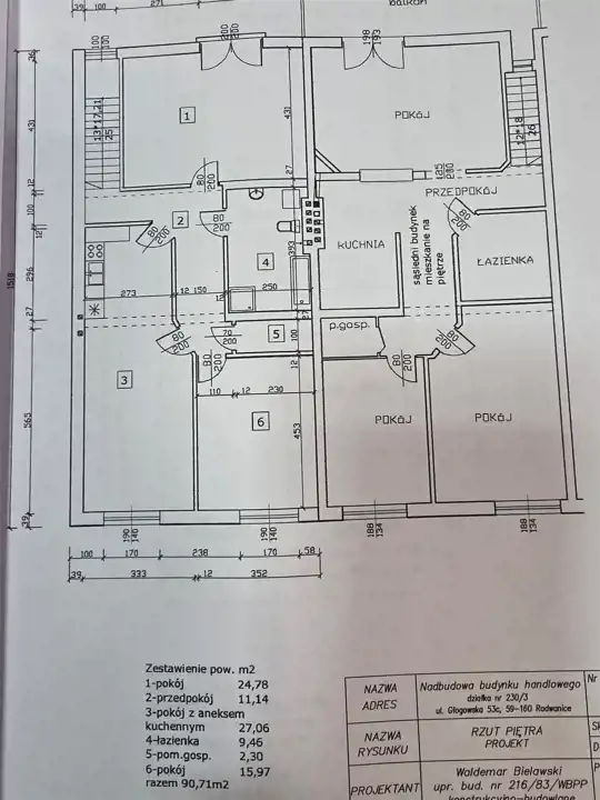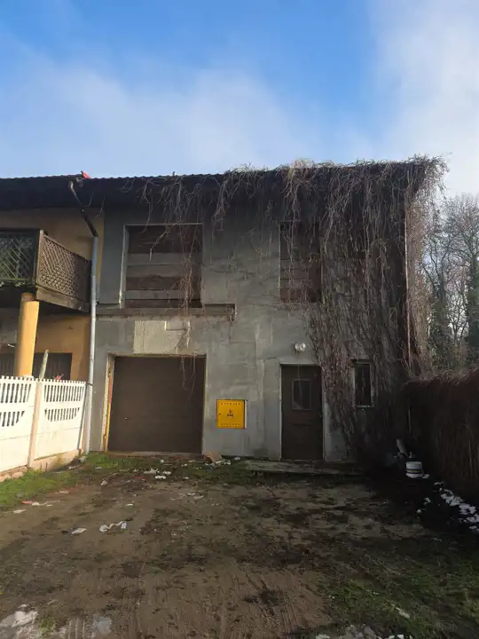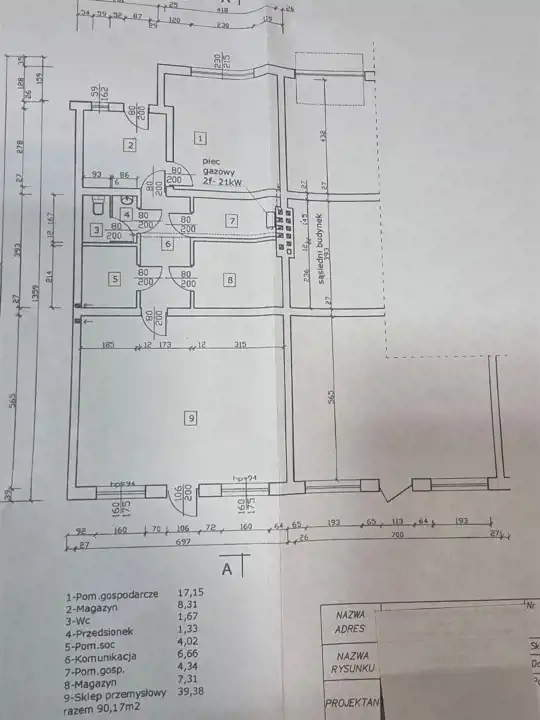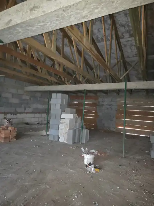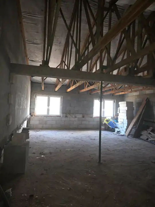Część mieszkalna o powierzchni 90 m2 położona na I piętrze znajduje się w stanie surowym, jedna powierzchnia do własnej aranżacji i wykończenia ( przykładowy układ pomieszczeń załączony na rzucie).