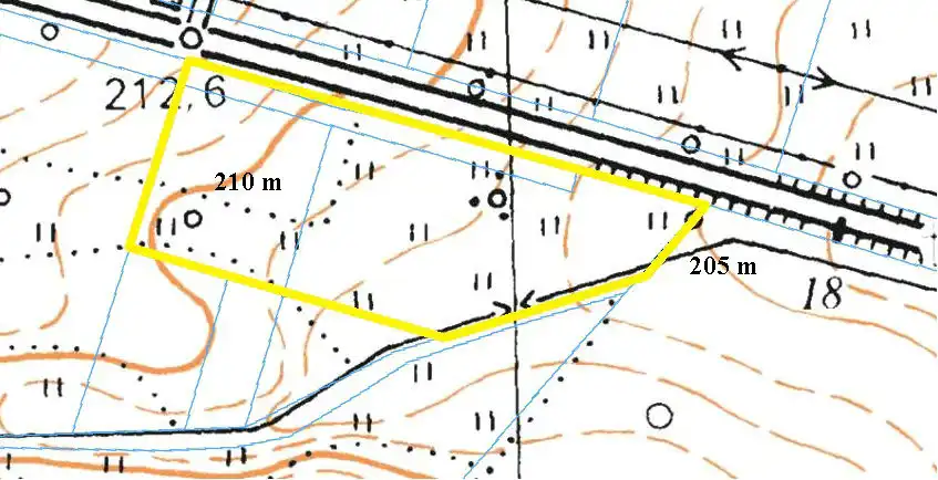Działka w kształcie trapezu o podstawach 255 (bok przyległy do drogi krajowej nr 94) i 155 m na 94 metry (bok przy planowanej drodze dojazdowej)