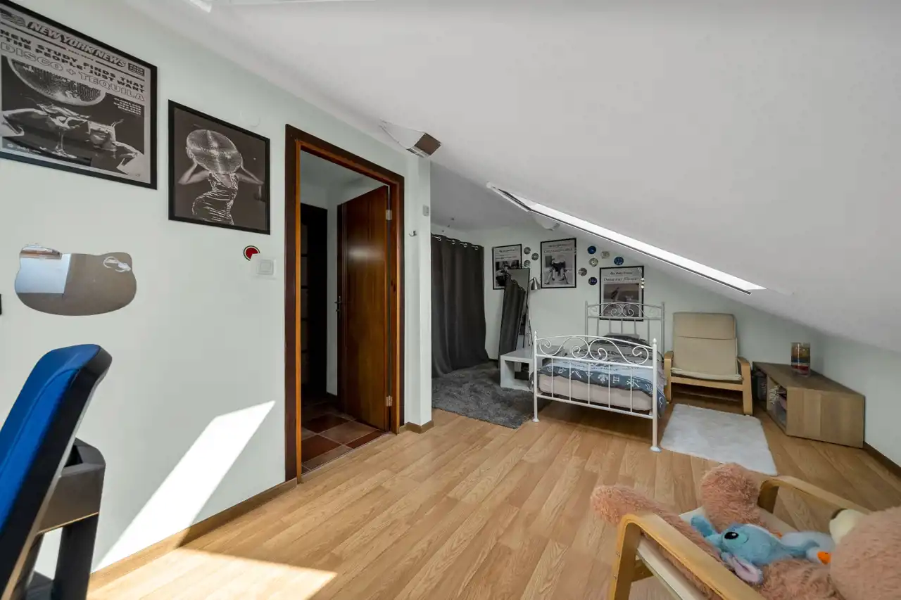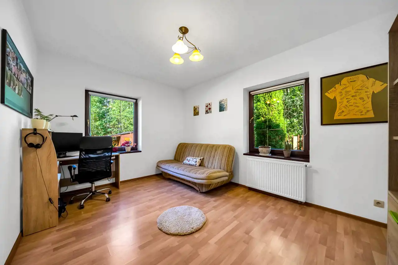 - **Piętro:** Sypialnia, łazienka, gabinet, przestrzeń wspólna