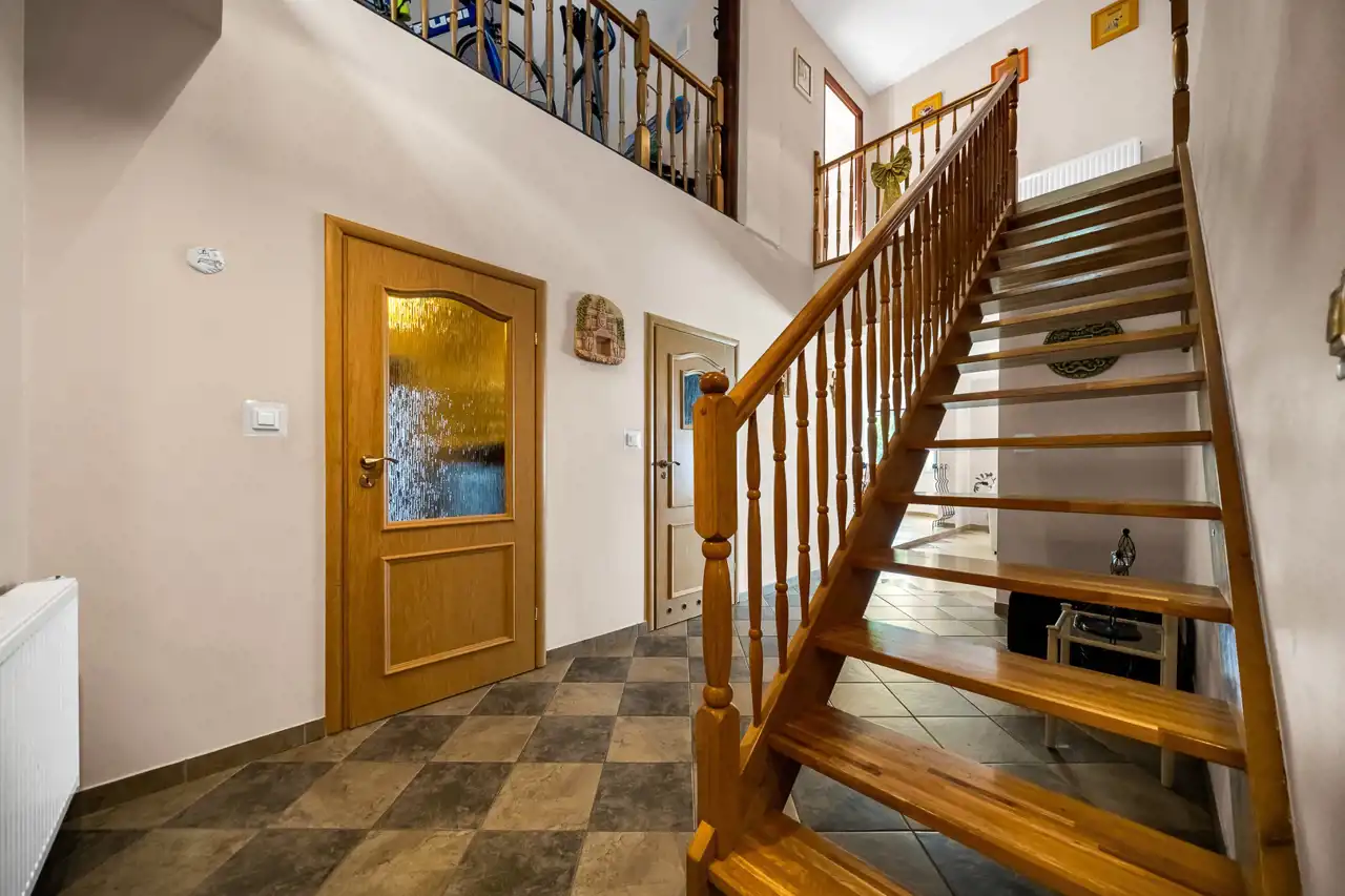 - **Parter:** Przestronny salon z otwartą kuchnią i jadalnią, dwie sypialnie, łazienka