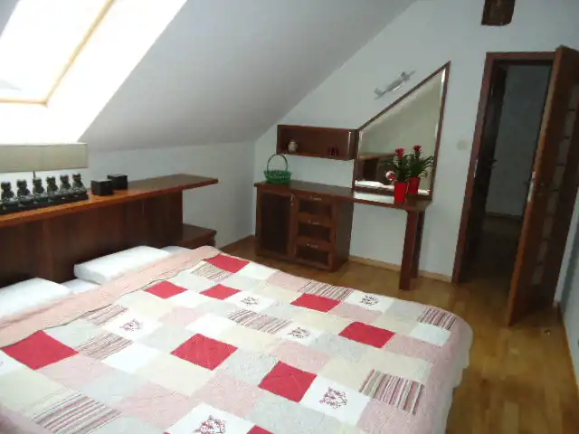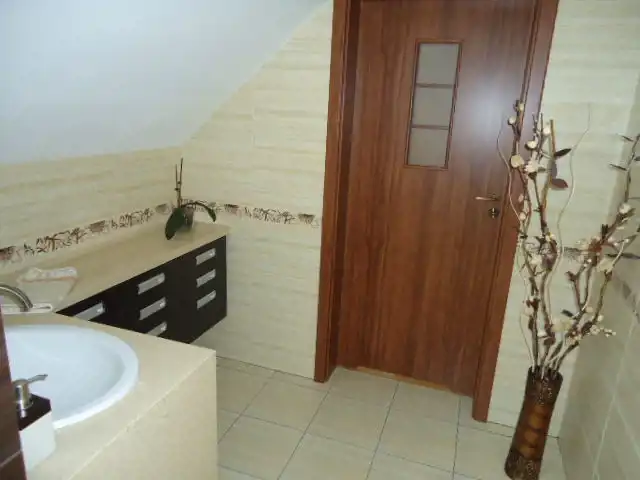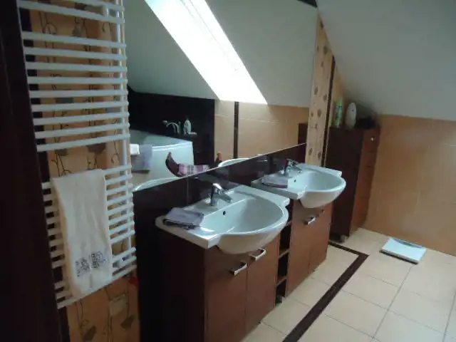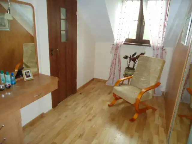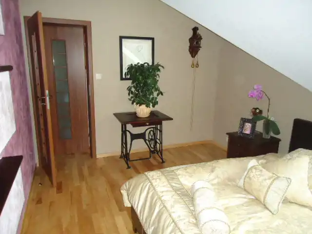 Mniejsza niepodpiwniczona część domu posiada oddzielną otwartą na salon kuchnie w zabudowie, z lodówką, zmywarką, kuchnią indukcyjną z piekarnikiem i okapem, przytulny salon z kominkiem oraz wyjściem na taras, sypialnię z zabudowaną szafą, łazienka z kabiną prysznicową. Na piętrze znajduje się, pokój gościnny, sypialnia z oddzielną toaletką i dużą garderobą oraz przestronna łazienka wyposażona w wannę z hydromasażem.