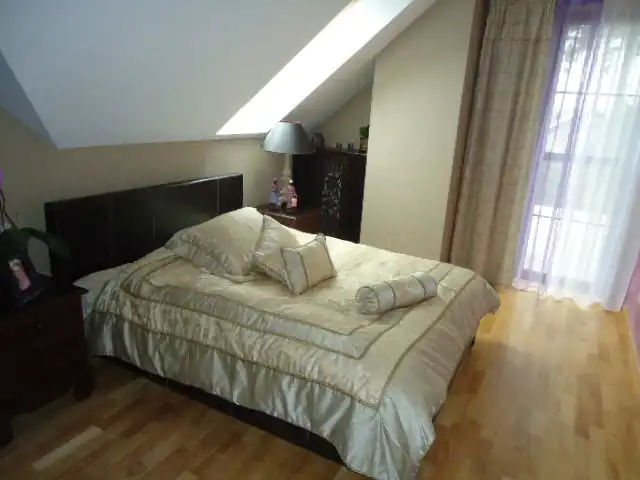 PIĘTRO: Na górze, na którą prowadzą podświetlane jesionowe schody znajdują się trzy jasne sypialnie z zabudowami stałymi, dwie przestronne garderoby oraz pokój kąpielowy wyposażony w kabinę prysznicową i dużą wannę z hydromasażem. W dziecinnej sypialni ogrzewanie ścienno-sufitowe.