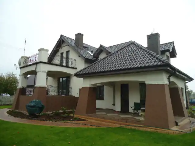 Ocieplony styropianem i pokryty tynkiem ozdobnym Ceresit. Dach pokryty dachówką ceramiczną. Obie części domu posiadają niezależne wejścia.
